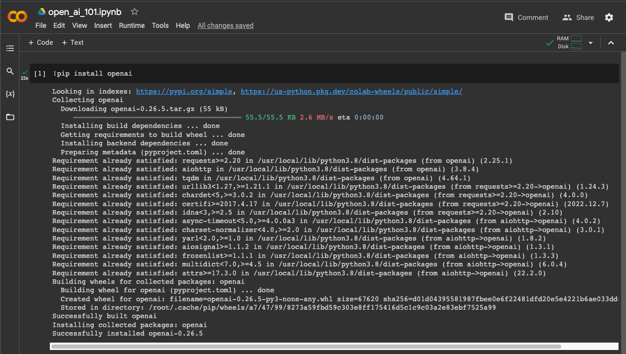 Colab已经是一个Python Notebook的环境了。所以我们不需要再去安装Python和JupyterLab了。不过我们还是需要安装OpenAI的库,以及设定我们的API Key。你只需要在Notebook开始的时候,执行下面这样一小段代码就可以做到这一点。