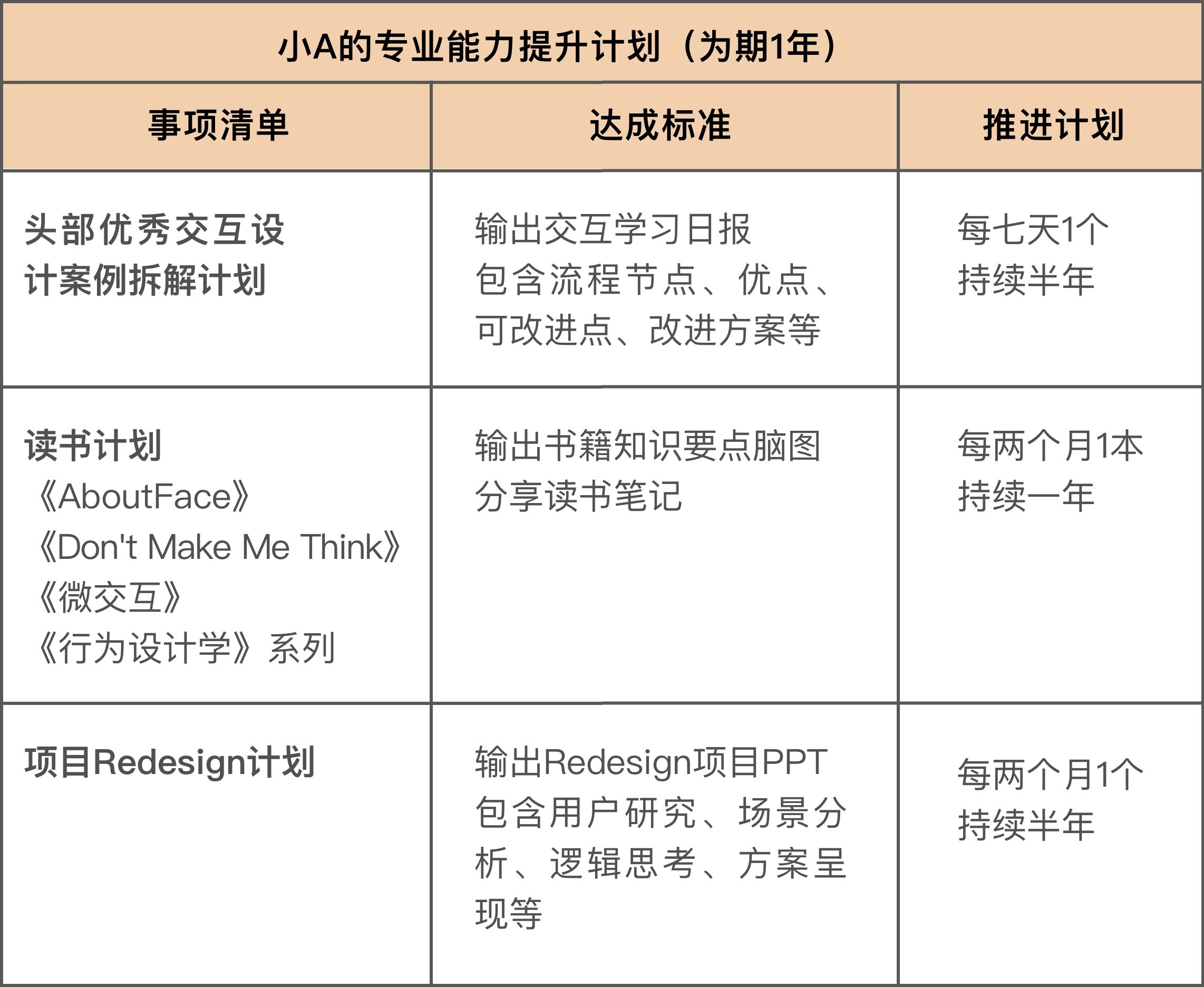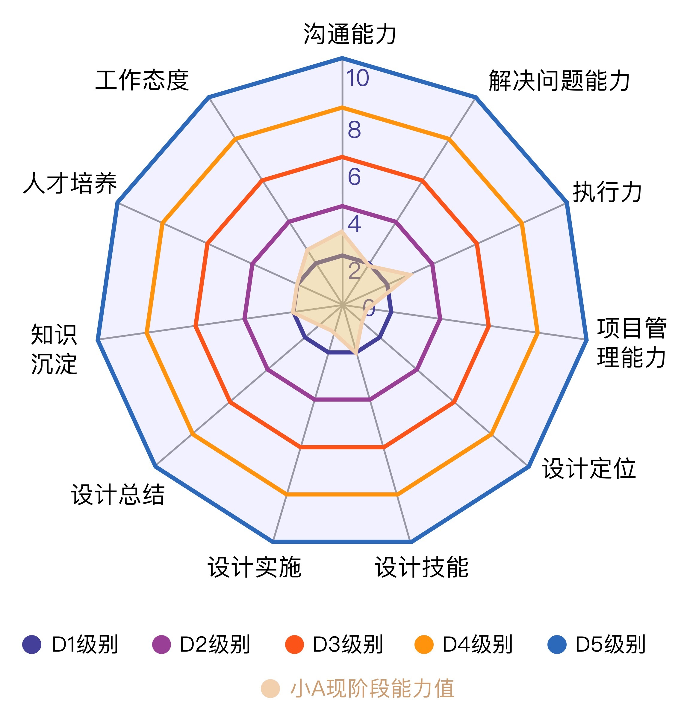 通过成长面谈,小A对自己的能力有了一个客观的认知。他结合我们团队的设计师能力指标量化,给自己设定了第一个阶段性的目标:利用一年的时间,让专业能力达到D2级别。