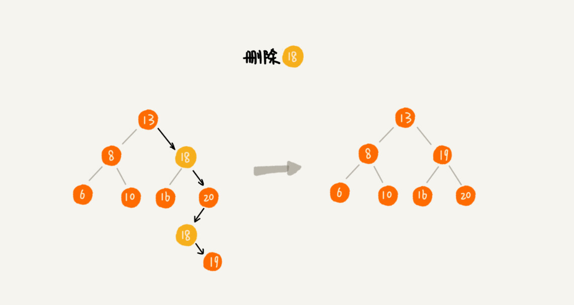 第三种情况是,如果要删除的节点有两个子节点,这就比较复杂了。我们需要找到这个节点的右子树中的最小节点,把它替换到要删除的节点上。然后再删除掉这个最小节点,因为最小节点肯定没有左子节点(如果有左子结点,那就不是最小节点了),所以,我们可以应用上面两条规则来删除这个最小节点。比如图中的删除节点18。