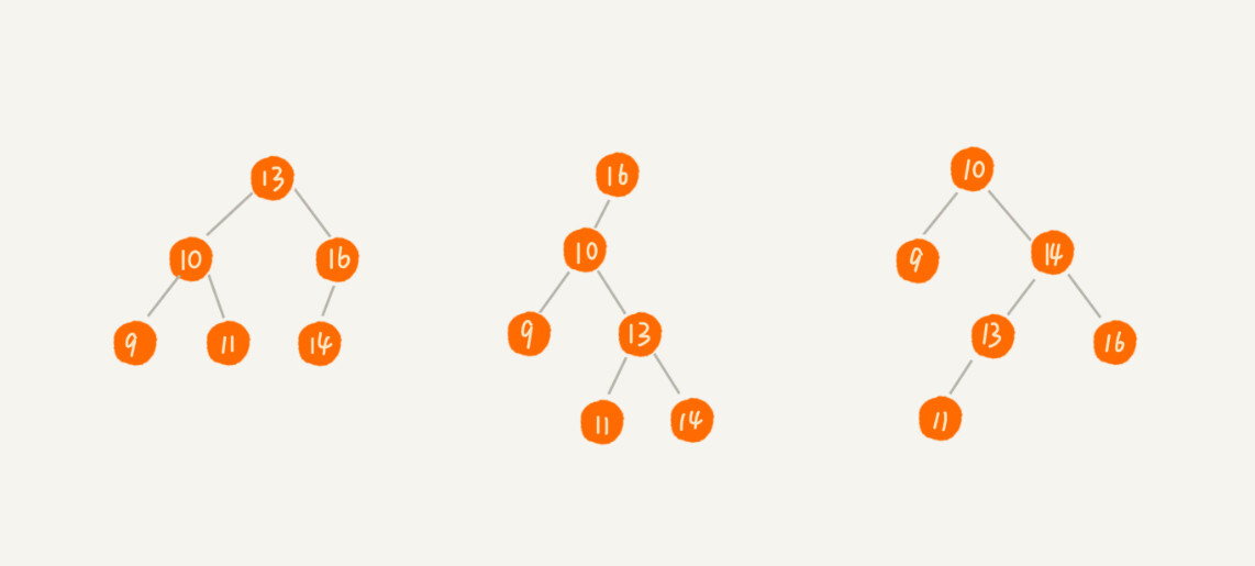 实际上,二叉查找树的形态各式各样。比如这个图中,对于同一组数据,我们构造了三种二叉查找树。它们的查找、插入、删除操作的执行效率都是不一样的。图中第一种二叉查找树,根节点的左右子树极度不平衡,已经退化成了链表,所以查找的时间复杂度就变成了O(n)。