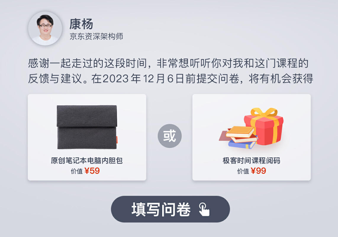 我知道有很多同学都在努力学习,默默潜水。在专栏结束的今天,你不妨在留言区里聊聊学习这门课感受。我还准备了一份结课问卷,希望你能花几分钟填写一下,我会根据你的反馈继续优化课程。