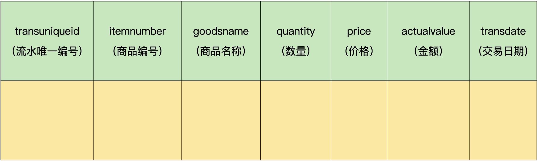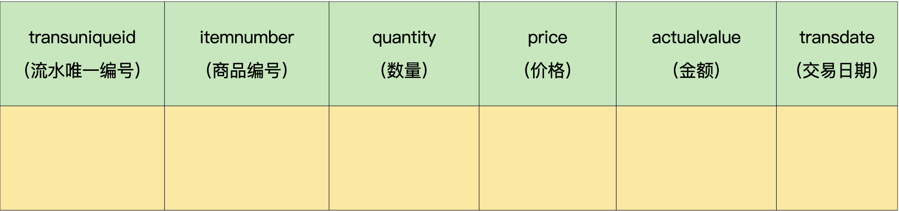 在这个项目中,我们有一个400万条记录的流水数据。为了方便你理解,这里我只保留2个字段,分别是商品编号字段itemnumber和流水唯一编号字段transuniqueid。流水唯一编号用于在系统中唯一标识一条流水。