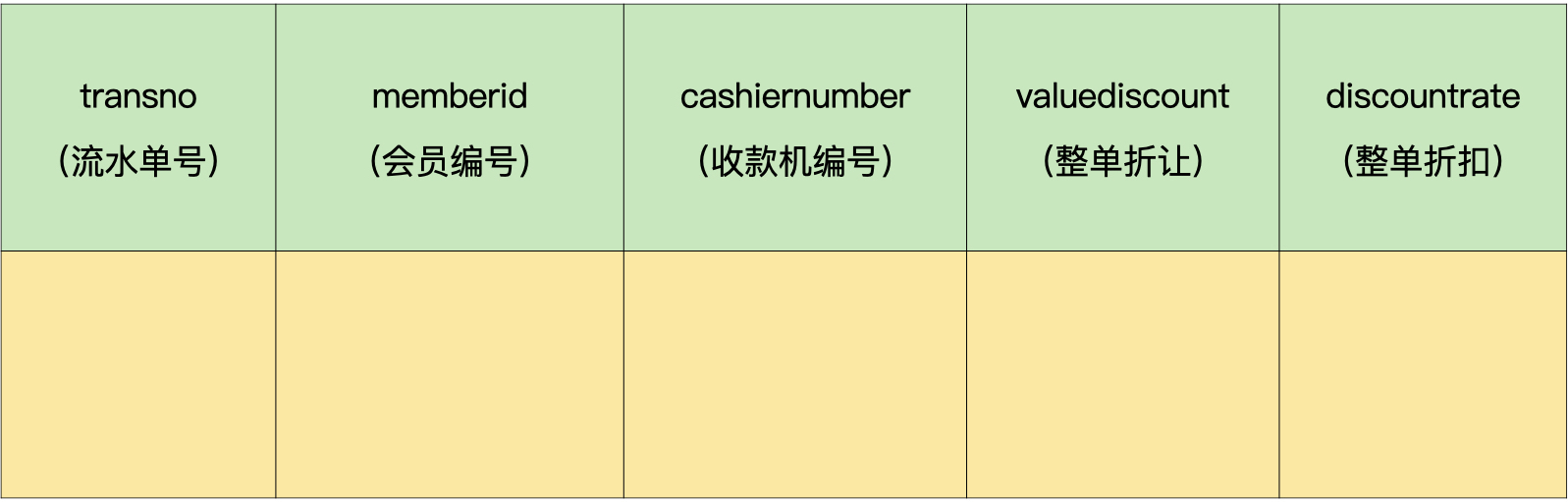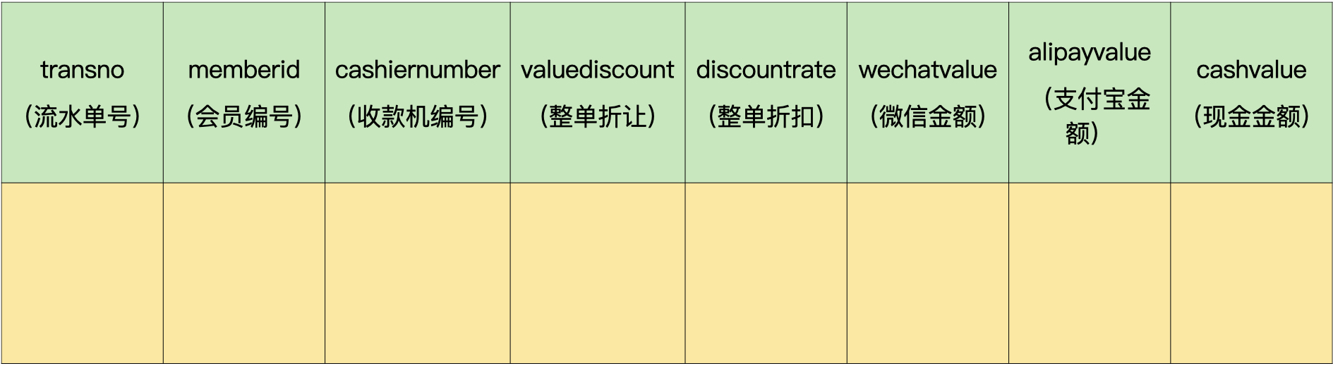 举个小例子,比如流水单头表中包含流水单号、会员编号、收款机编号、整单折让、整单折扣、微信收款金额、支付宝收款金额、现金金额等字段。