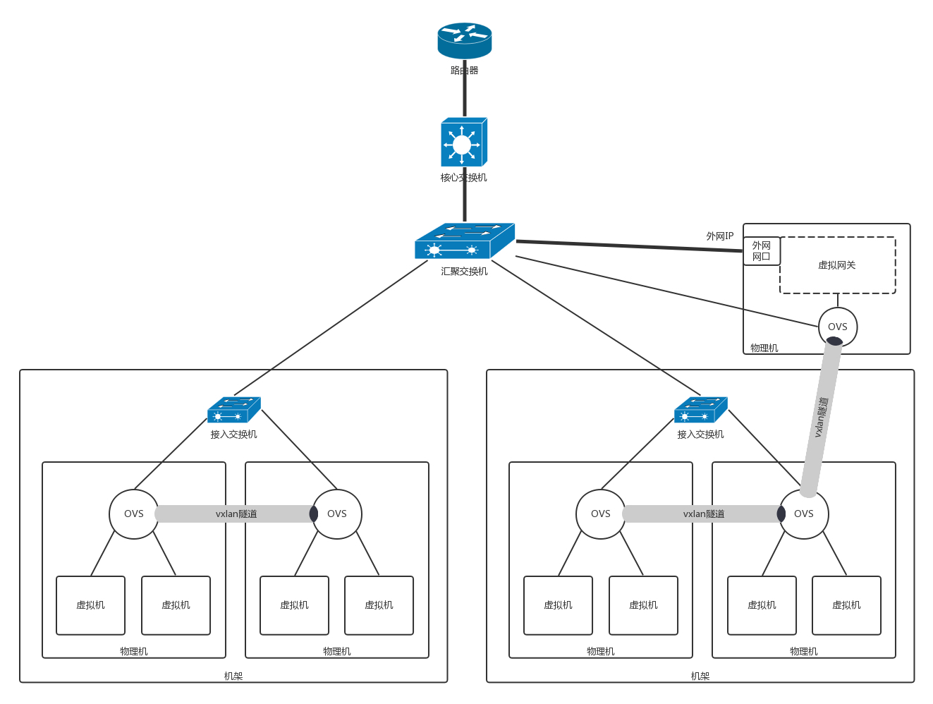 我们来回想[数据中心]那一节,每个可用区里有一片一片的机柜,每个机柜上有一排一排的服务器,每个机柜都有一个接入交换机,有一个汇聚交换机将多个机柜连在一起。
