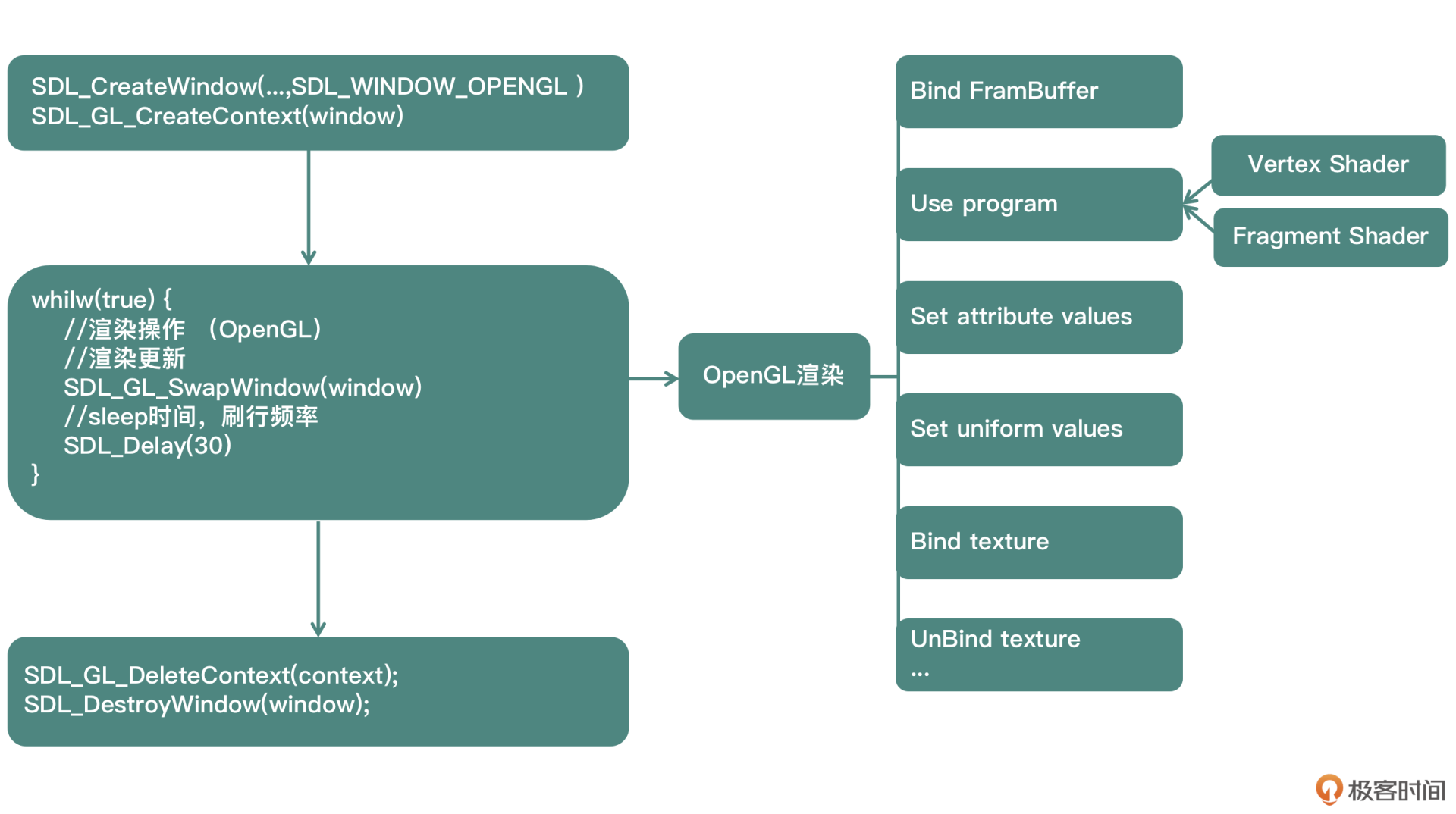 接下来就是整个使用SDL渲染的整体流程,在讲解过程中我们参考这个流程结构图。