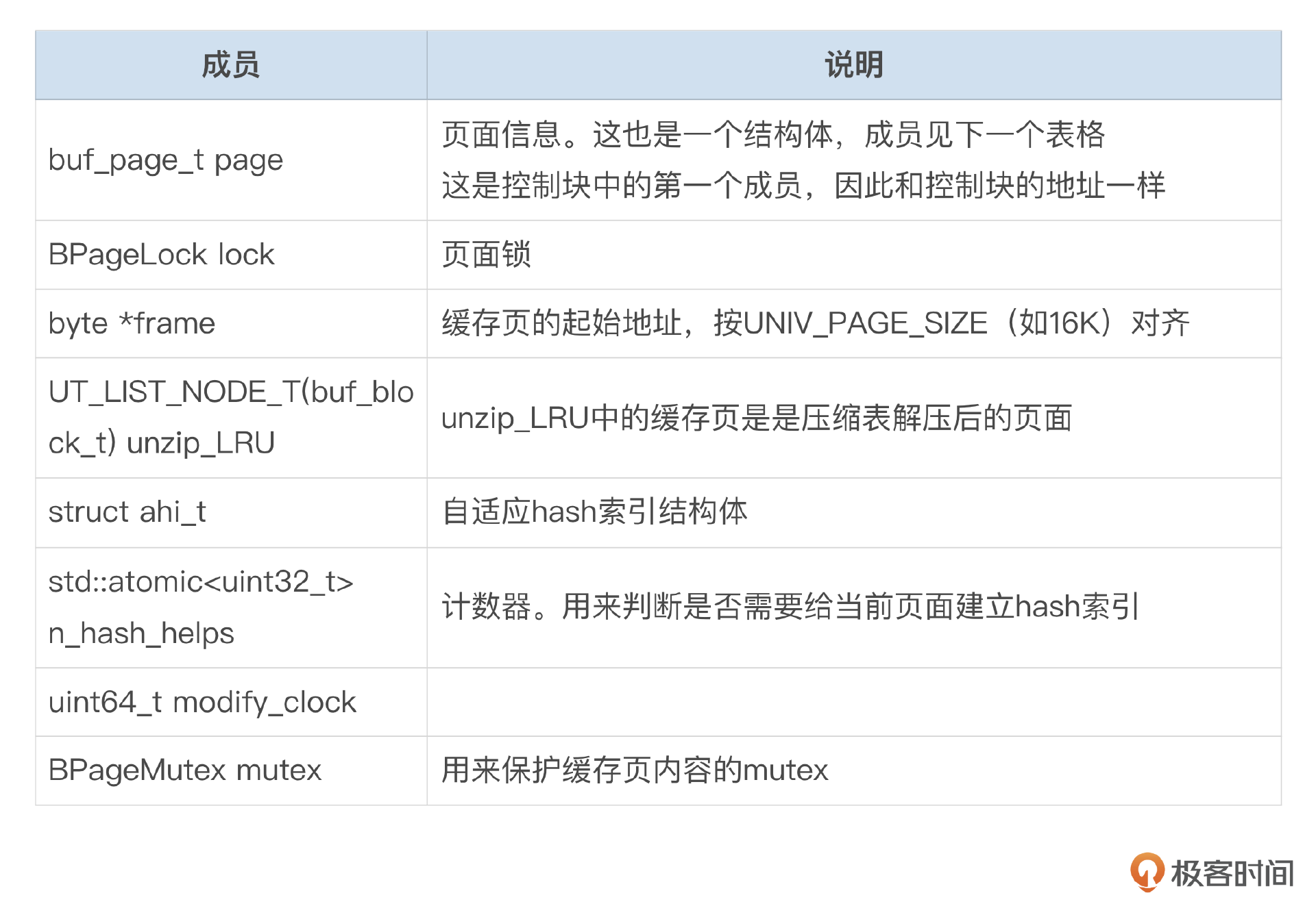 控制块在MySQL的源码中是一个结构体,结构体的成员可以参考下面这两个表格。