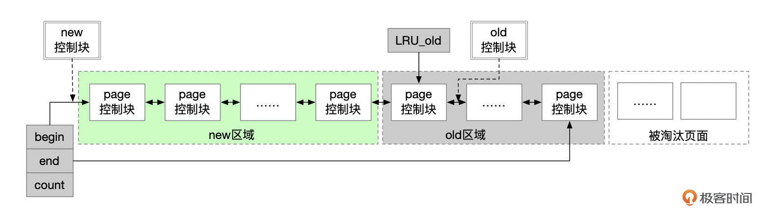 InnoDB会从LRU链表的尾部淘汰页面。InnoDB使用了改良的LRU算法,将LRU链表分为new和old这两个区域。OLD区域的占比由参数innodb_old_blocks_pct控制,该参数默认为37,也就是LRU链表中,尾部大约3/8的页面被划入OLD区。