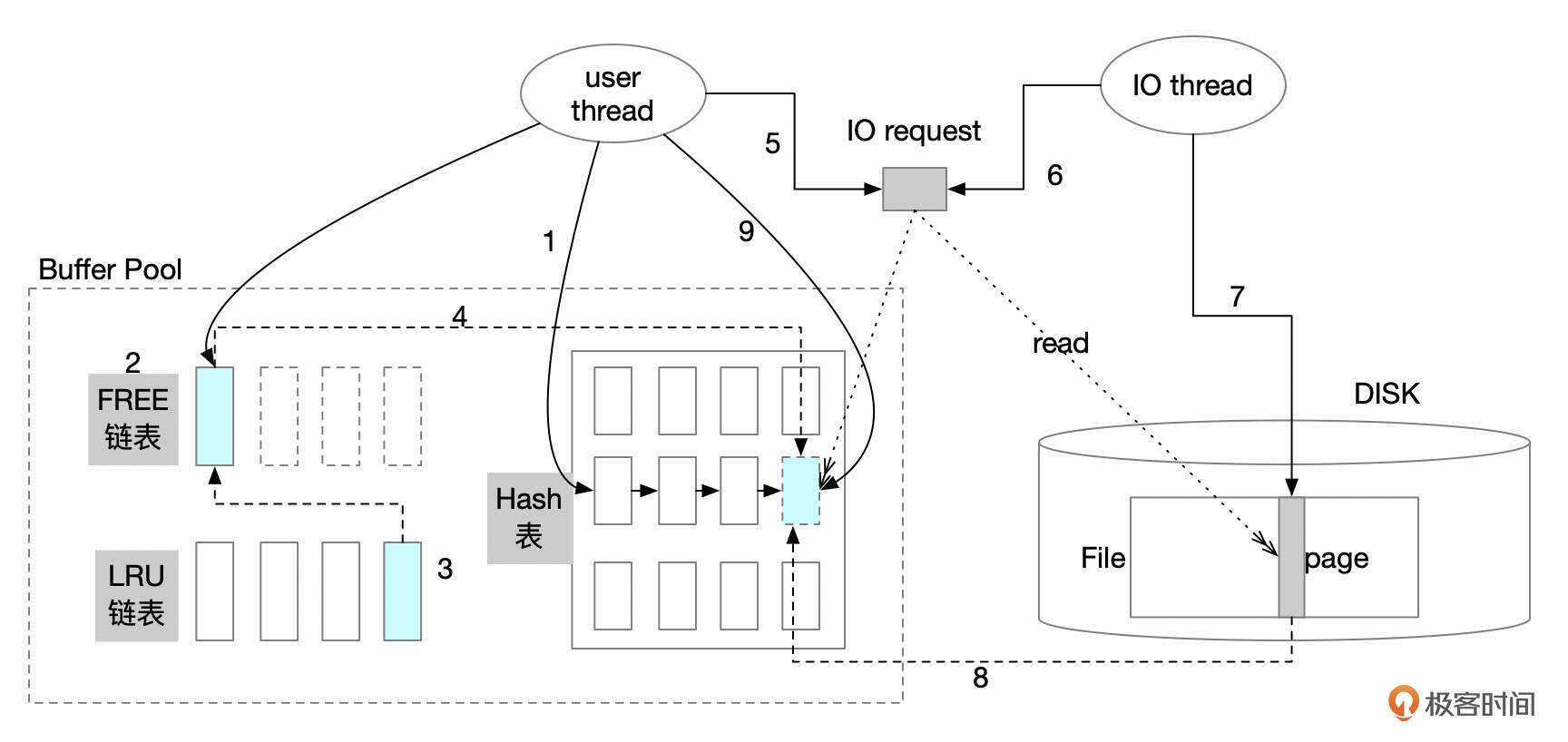 - 如果FREE链表中没有空闲页面,需要到LRU链表尾部淘汰掉一个页面。淘汰的页面先加入到FREE链表,然后再分配给用户线程使用。