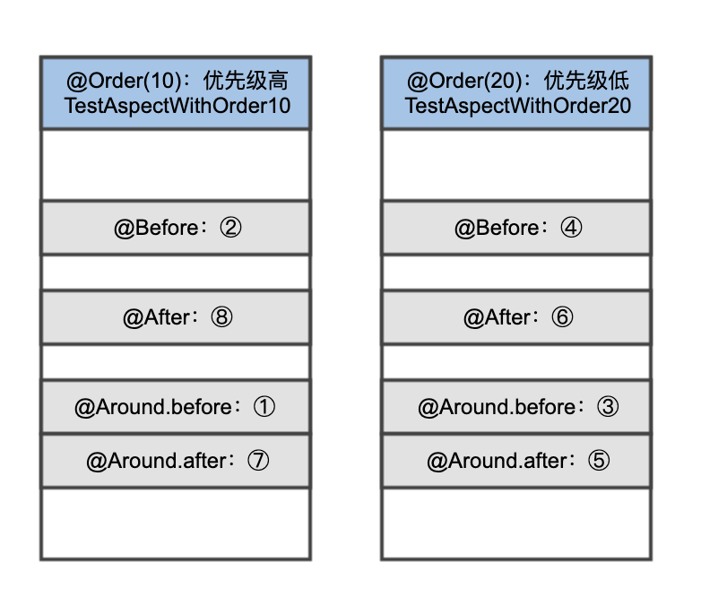 | @Aspect @Component @Order(10) @Slf4j public class TestAspectWithOrder10 { @Before("execution(* org.geekbang.time.commonmistakes.springpart1.aopmetrics.TestController.*(..))") public void before(JoinPoint joinPoint) throws Throwable { log.info("TestAspectWithOrder10 @Before"); } @After("execution(* org.geekbang.time.commonmistakes.springpart1.aopmetrics.TestController.*(..))") public void after(JoinPoint joinPoint) throws Throwable { log.info("TestAspectWithOrder10 @After"); } @Around("execution(* org.geekbang.time.commonmistakes.springpart1.aopmetrics.TestController.*(..))") public Object around(ProceedingJoinPoint pjp) throws Throwable { log.info("TestAspectWithOrder10 @Around before"); Object o = pjp.proceed(); log.info("TestAspectWithOrder10 @Around after"); return o; } }
