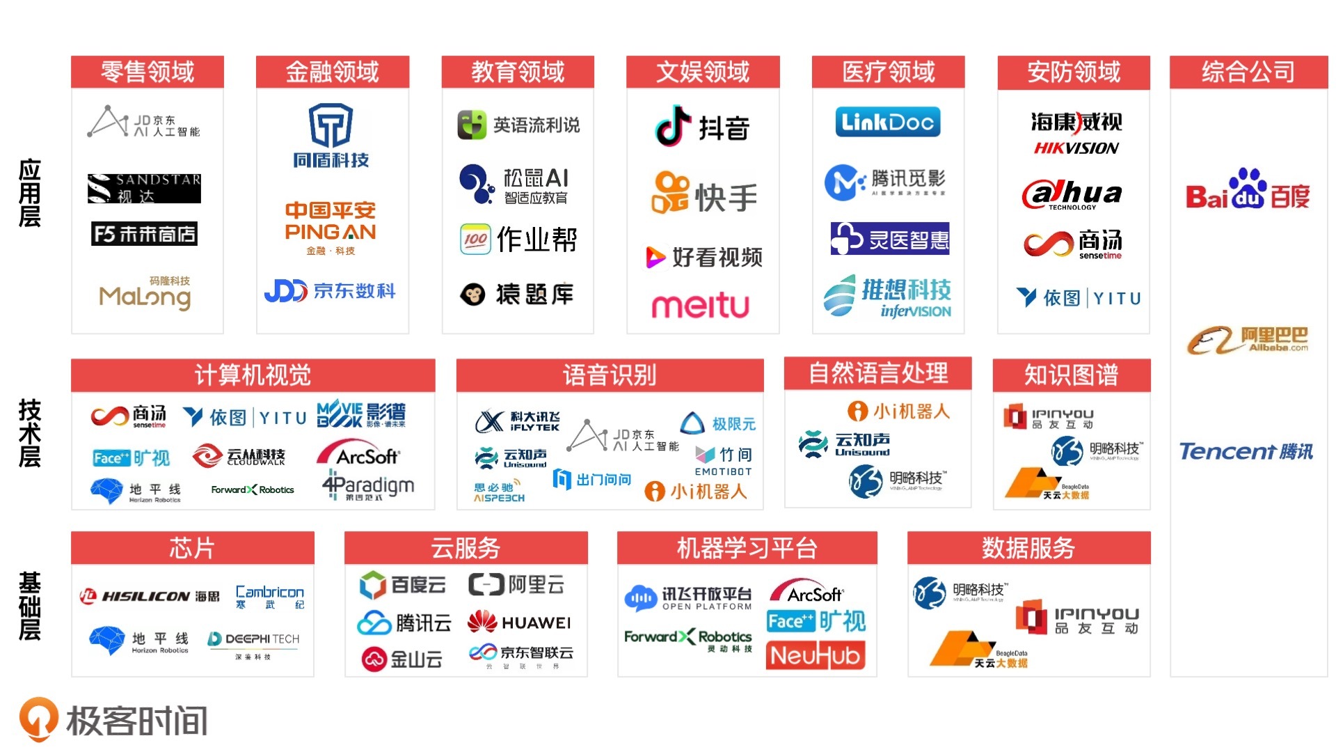 再上一层的技术层是 AI 技术的提供者,我按照技术类别对它进行了划分。这里面,我们比较熟悉的企业有商汤、依图,它们主要是提供计算机视觉服务,最常见的应用场景就是人脸识别了。