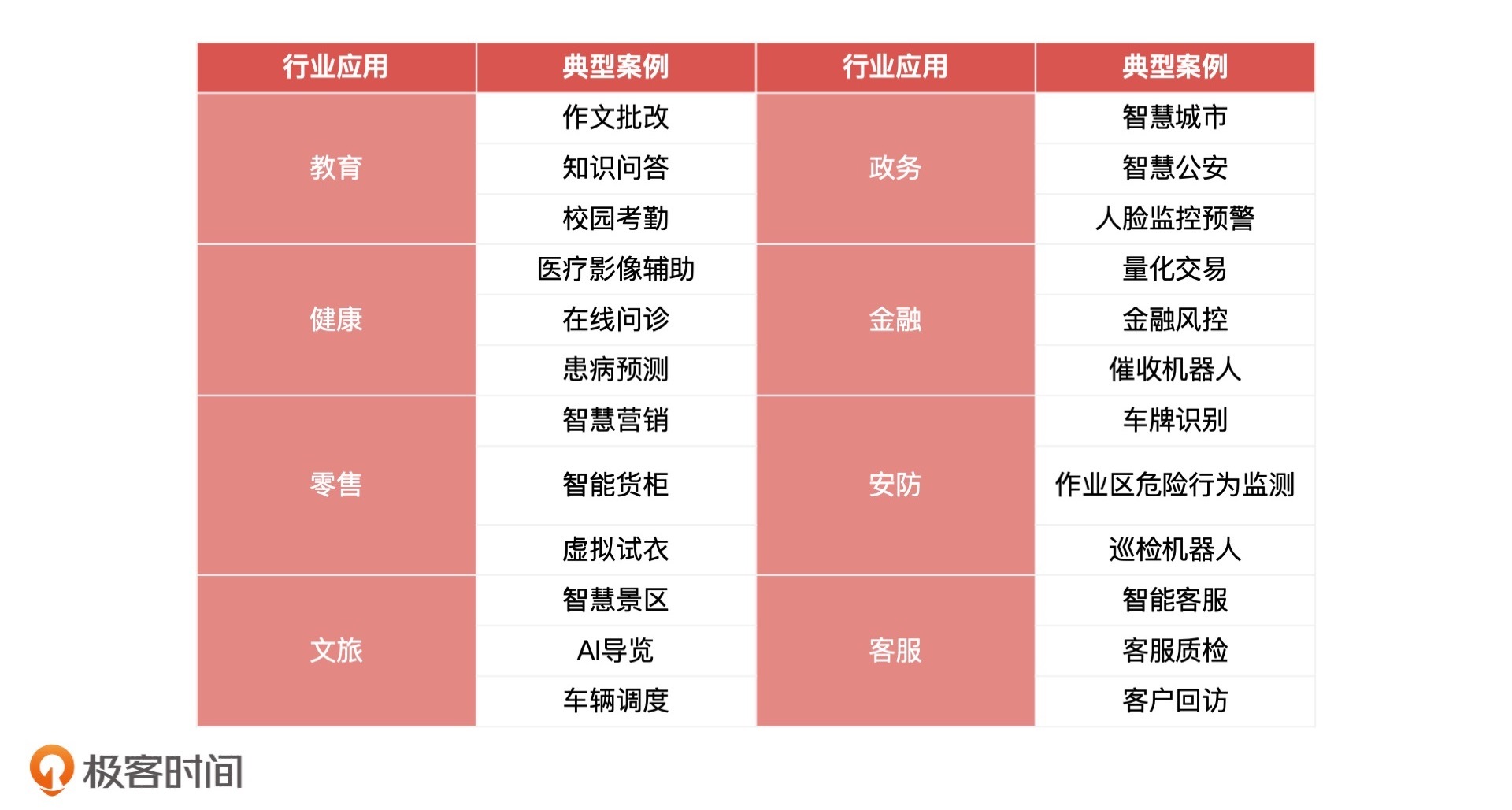 上面的全景图告诉了我们,整个产业链的分层和每层的典型公司都有哪些。不过如果想要转到 AI 行业,你还需要多了解一些行业内的成熟应用。下面这张典型应用案例图就能帮到你。