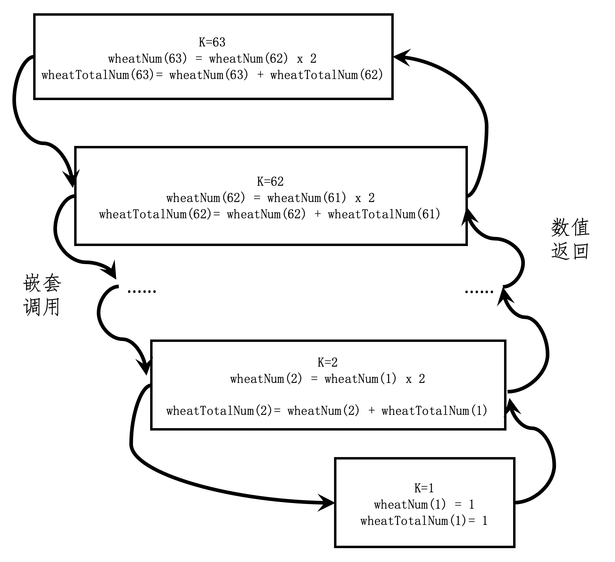 从这个图可以看出,函数从$k=63$开始调用,然后调用$k-1$,也就是$62$,一直到$k=1$的时候,嵌套调用结束,$k=1$的函数体开始返回值给$k=2$的函数体,一直到$k=63$的函数体。从$k=63, 62, …, 2, 1$的嵌套调用过程,其实就是体现了数学归纳法的核心思想,我把它称为逆向递推。而从$k=1, 2, …, 62, 63$的值返回过程,和上一篇中基于循环的迭代是一致的,我把它称为正向递推。