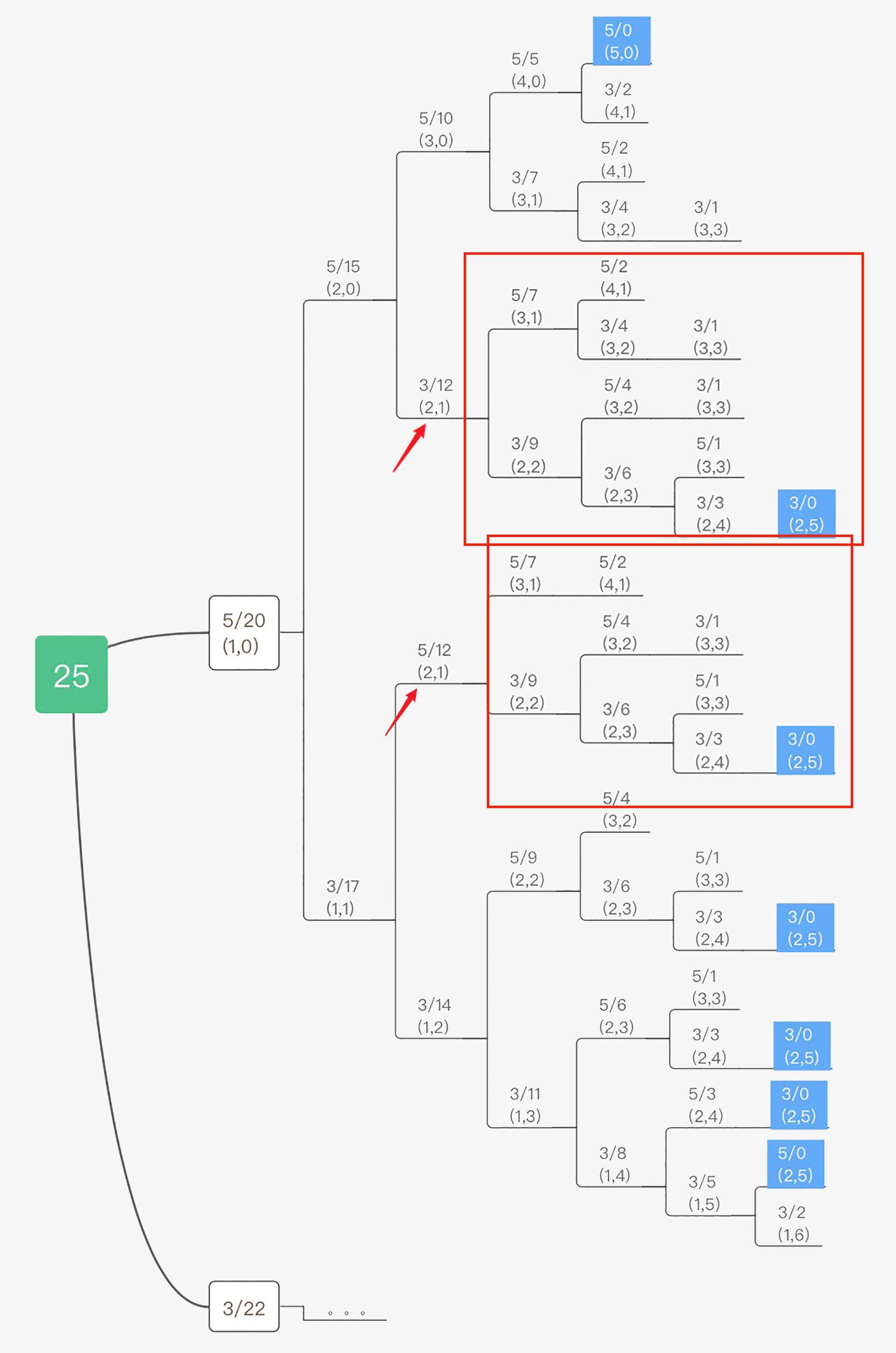 从上图中,我们看到了类似的模式,我同样圈选出了两个红色区域,其中第2个即5/12(2, 1)的递归子问题与第1个 3/12(2, 1) 的递归子问题完全相同,因此它们是重叠子问题。