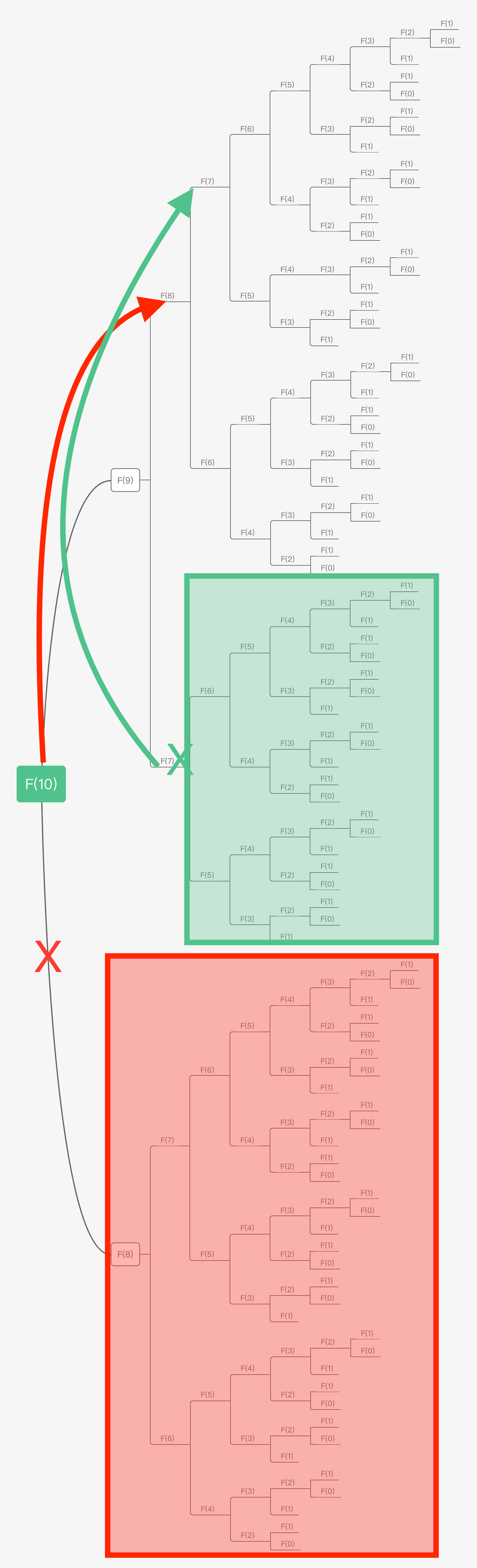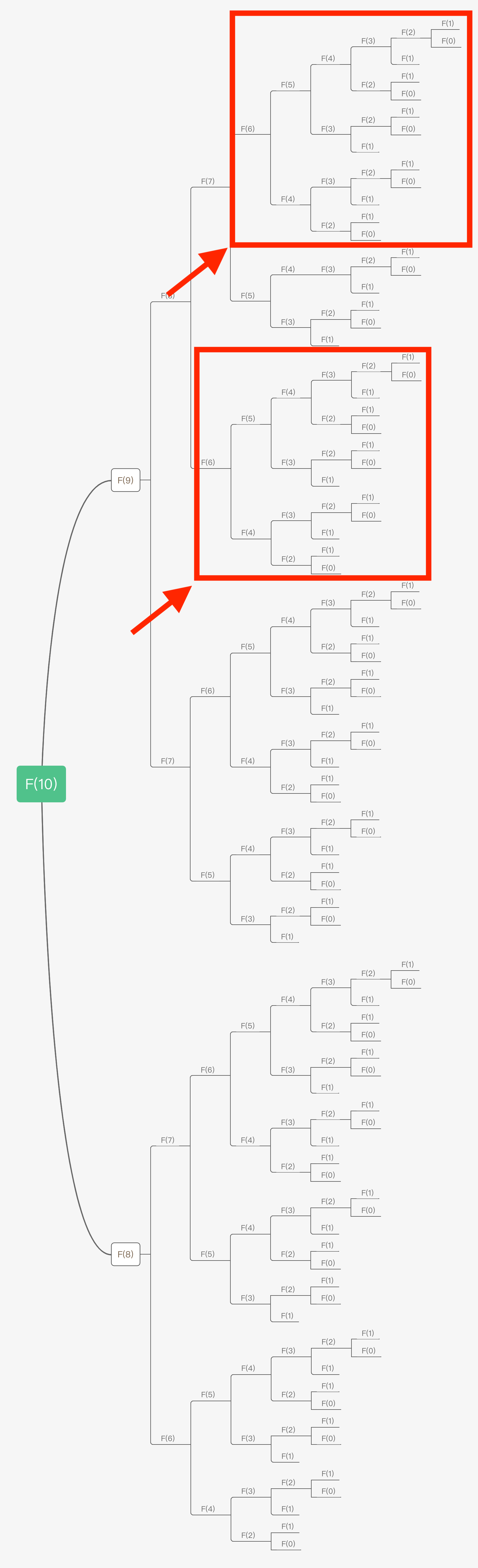 画完斐波那契数列的求解树之后,你发现问题没有?在我用红色标出的两个区域中,它们的递归计算过程完全相同!