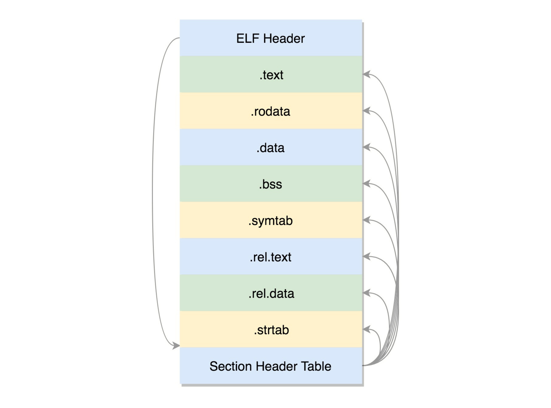 这些节的元数据信息也需要有一个地方保存,就是最后的节头部表(Section Header Table)。在这个表里面,每一个section都有一项,在代码里面也有定义struct elf32_shdr和struct elf64_shdr。在ELF的头里面,有描述这个文件的节头部表的位置,有多少个表项等等信息。