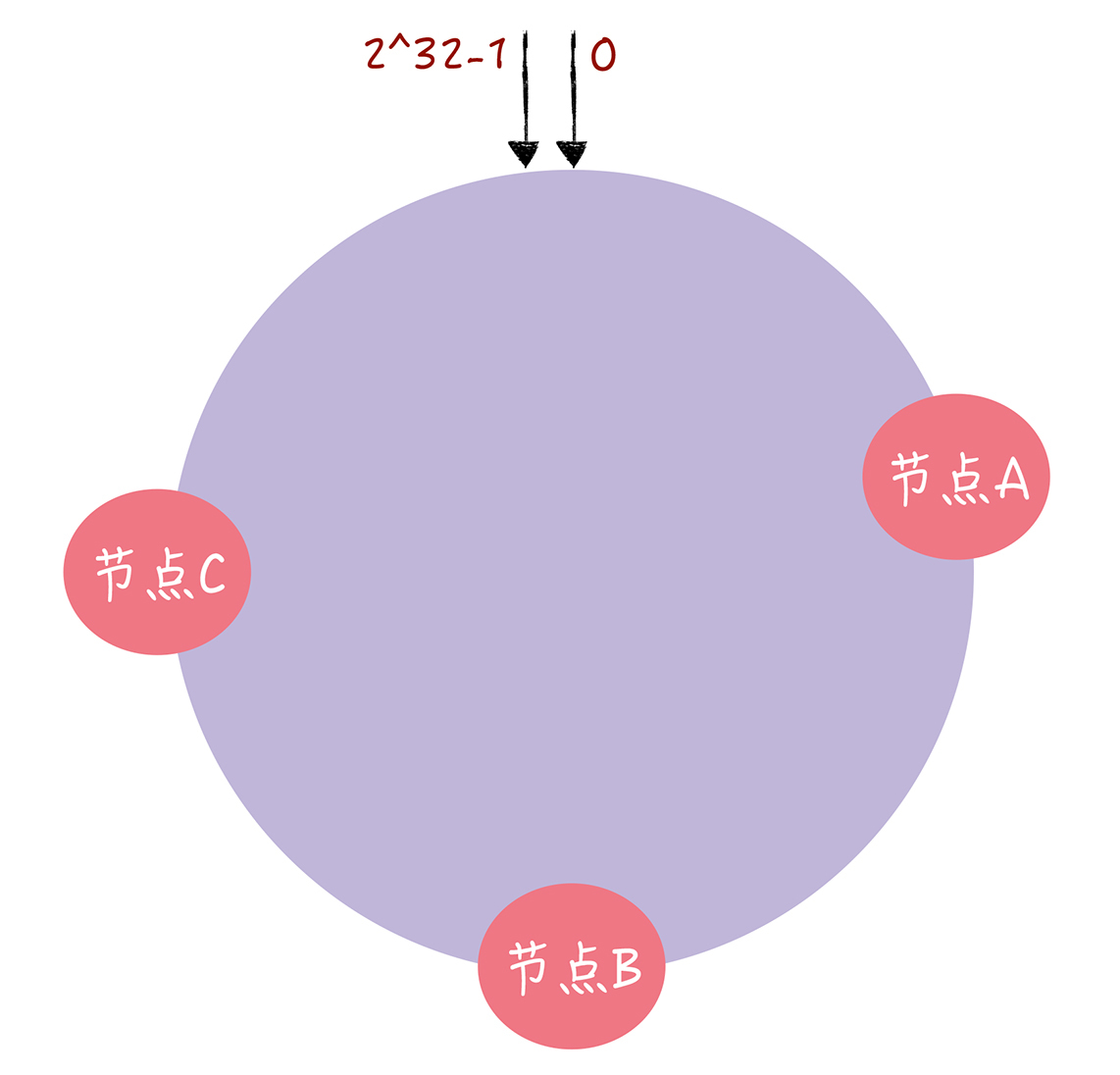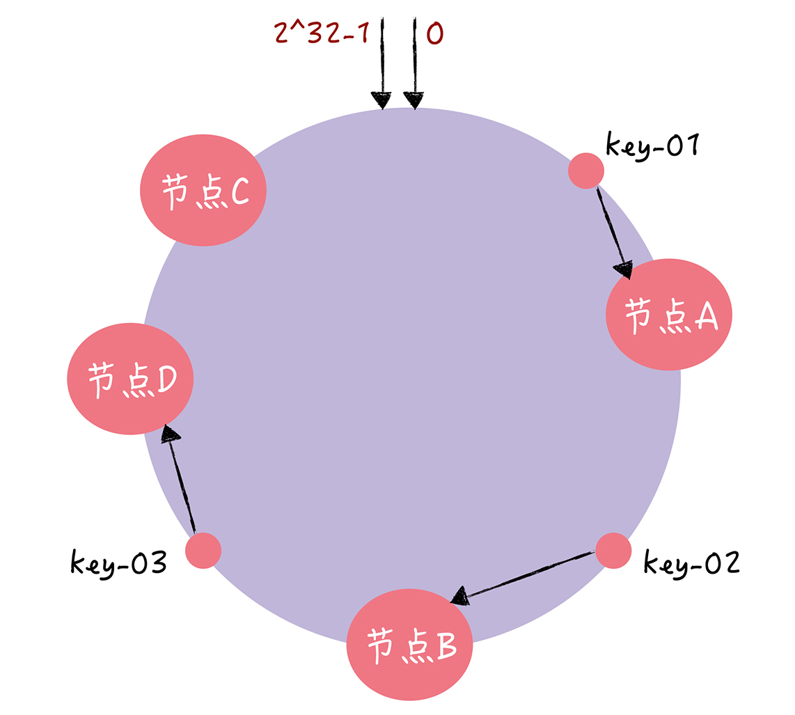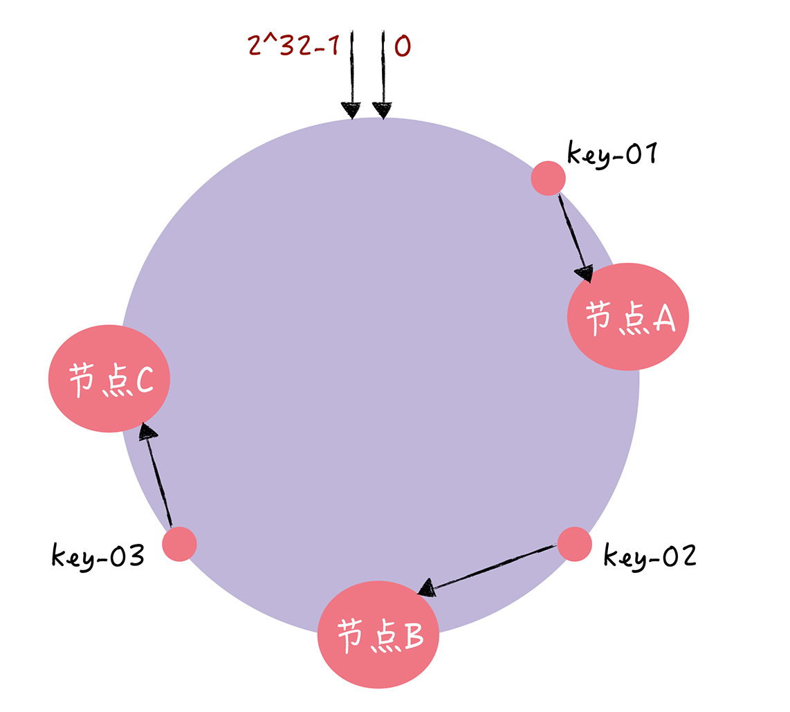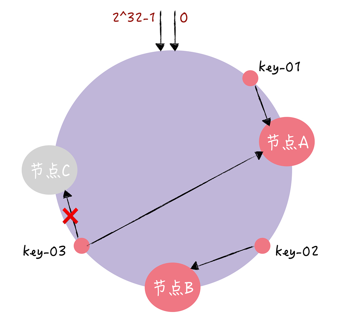 你可以看到,key-01和key-02不会受到影响,只有key-03的寻址被重定位到A。一般来说,在一致哈希算法中,如果某个节点宕机不可用了,那么受影响的数据仅仅是,会寻址到此节点和前一节点之间的数据。比如当节点C宕机了,受影响的数据是会寻址到节点B和节点C之间的数据(例如key-03),寻址到其他哈希环空间的数据(例如key-01),不会受到影响。