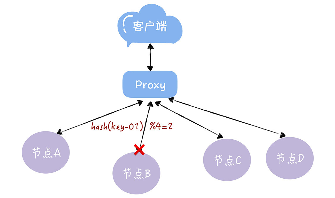 想象一下,假如3个节点不能满足业务需要了,这时我们增加了一个节点,节点的数量从3变化为4,那么之前的hash(key-01) % 3 = 1,就变成了hash(key-01) % 4 = X,因为取模运算发生了变化,所以这个X大概率不是1(可能X为2),这时你再查询,就会找不到数据了,因为key-01对应的数据,存储在节点A上,而不是节点B: