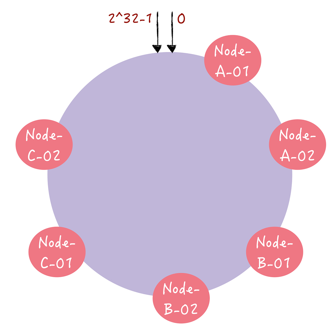 其实,就是对每一个服务器节点计算多个哈希值,在每个计算结果位置上,都放置一个虚拟节点,并将虚拟节点映射到实际节点。比如,可以在主机名的后面增加编号,分别计算 “Node-A-01”“Node-A-02”“Node-B-01”“Node-B-02”“Node-C-01”“Node-C-02”的哈希值,于是形成6个虚拟节点: