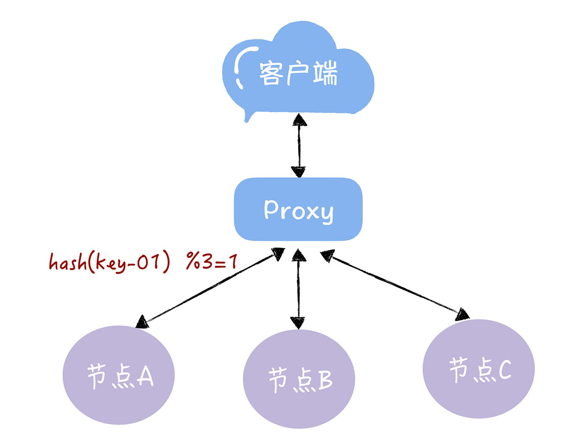 通过哈希算法,每个key都可以寻址到对应的服务器,比如,查询key是key-01,计算公式为hash(key-01) % 3 ,经过计算寻址到了编号为1的服务器节点A(就像图2的样子)。