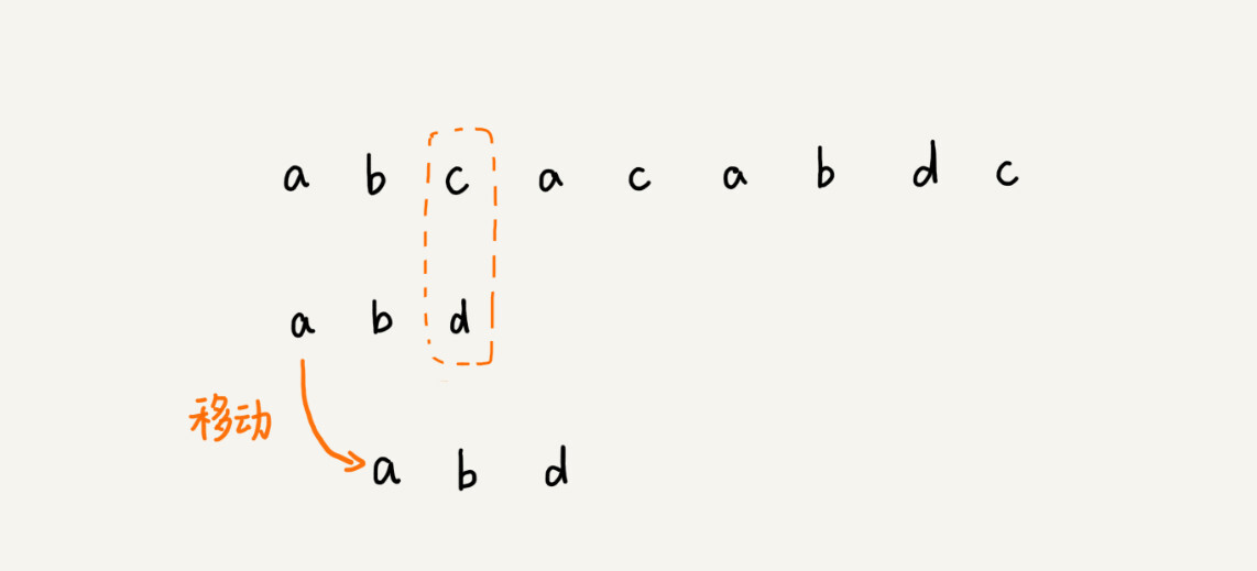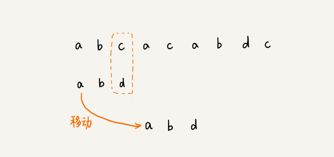 在这个例子里,主串中的c,在模式串中是不存在的,所以,模式串向后滑动的时候,只要c与模式串没有重合,肯定无法匹配。所以,我们可以一次性把模式串往后多滑动几位,把模式串移动到c的后面。