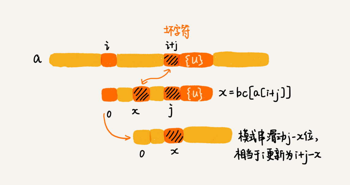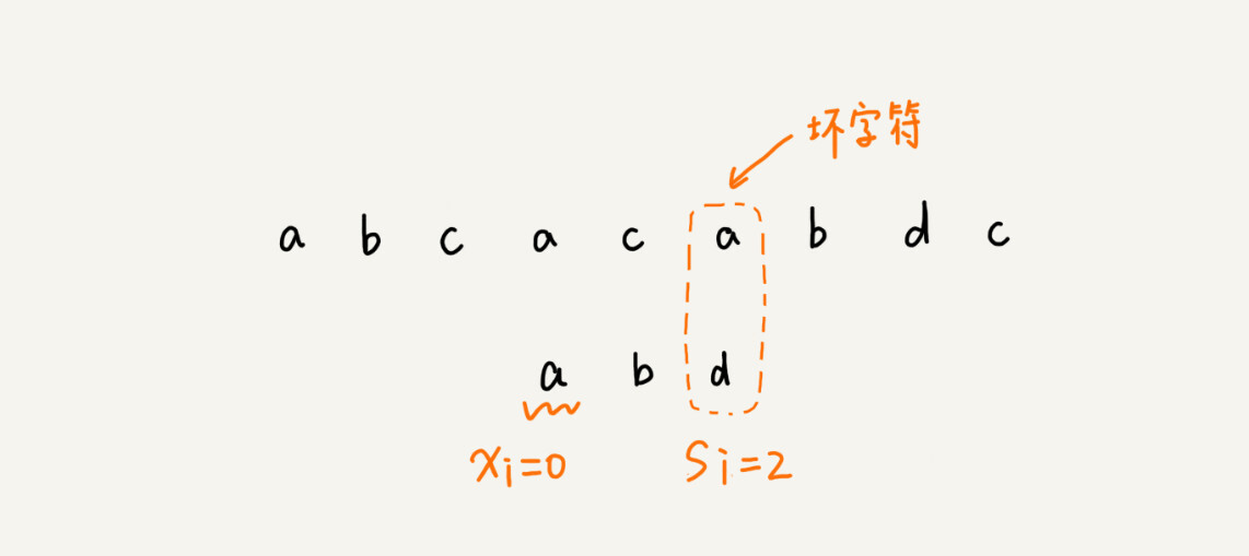 这里我要特别说明一点,如果坏字符在模式串里多处出现,那我们在计算xi的时候,选择最靠后的那个,因为这样不会让模式串滑动过多,导致本来可能匹配的情况被滑动略过。