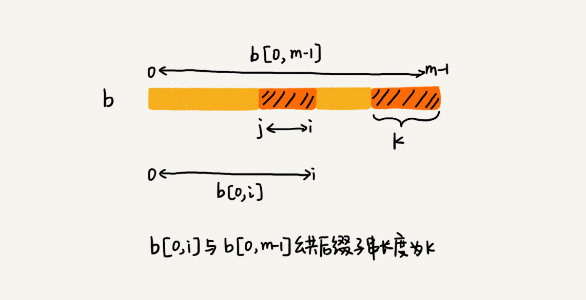 我们先来看,**如何表示模式串中不同的后缀子串呢?**因为后缀子串的最后一个字符的位置是固定的,下标为m-1,我们只需要记录长度就可以了。通过长度,我们可以确定一个唯一的后缀子串。