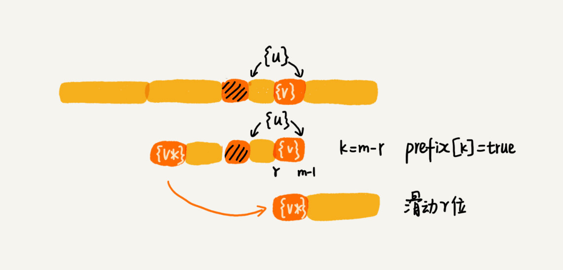 如果好后缀在模式串中不存在可匹配的子串,那在我们一步一步往后滑动模式串的过程中,只要主串中的{u}与模式串有重合,那肯定就无法完全匹配。但是当模式串滑动到前缀与主串中{u}的后缀有部分重合的时候,并且重合的部分相等的时候,就有可能会存在完全匹配的情况。