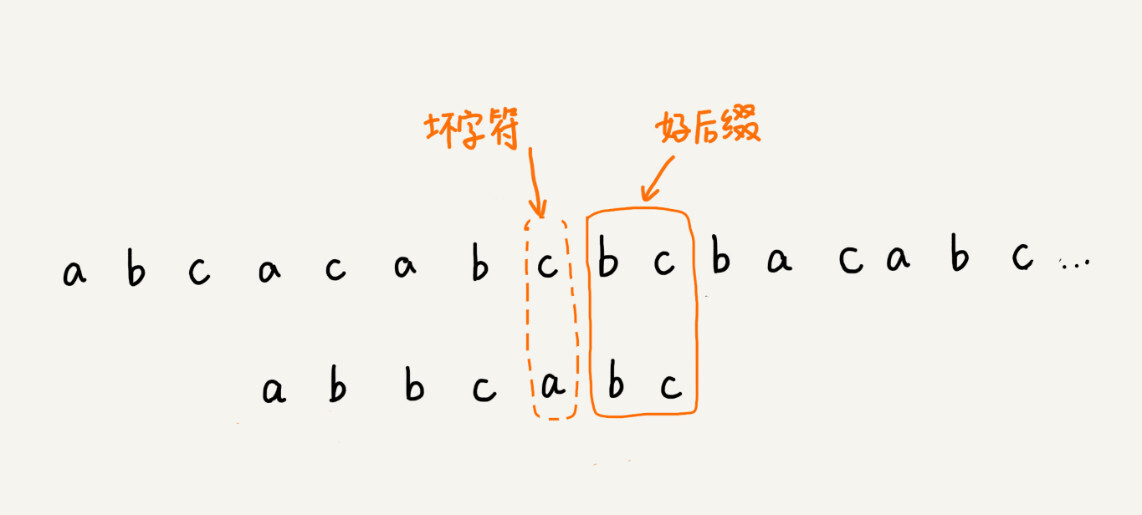 至此,我们已经实现了包含坏字符规则的框架代码,只剩下往框架代码中填充好后缀规则了。现在,我们就来看看,如何实现好后缀规则。它的实现要比坏字符规则复杂一些。