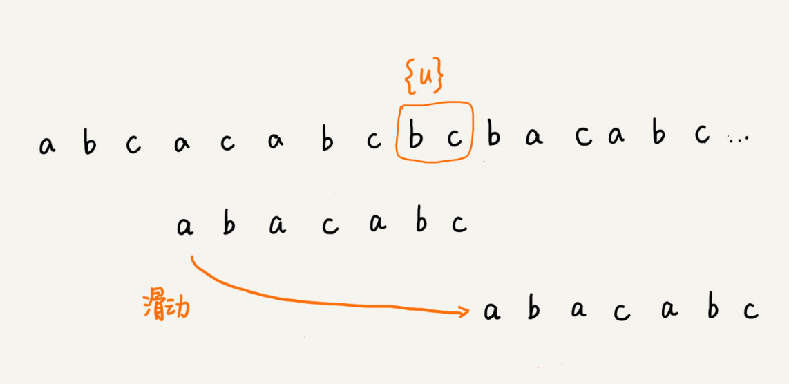 如果在模式串中找不到另一个等于{u}的子串,我们就直接将模式串,滑动到主串中{u}的后面,因为之前的任何一次往后滑动,都没有匹配主串中{u}的情况。