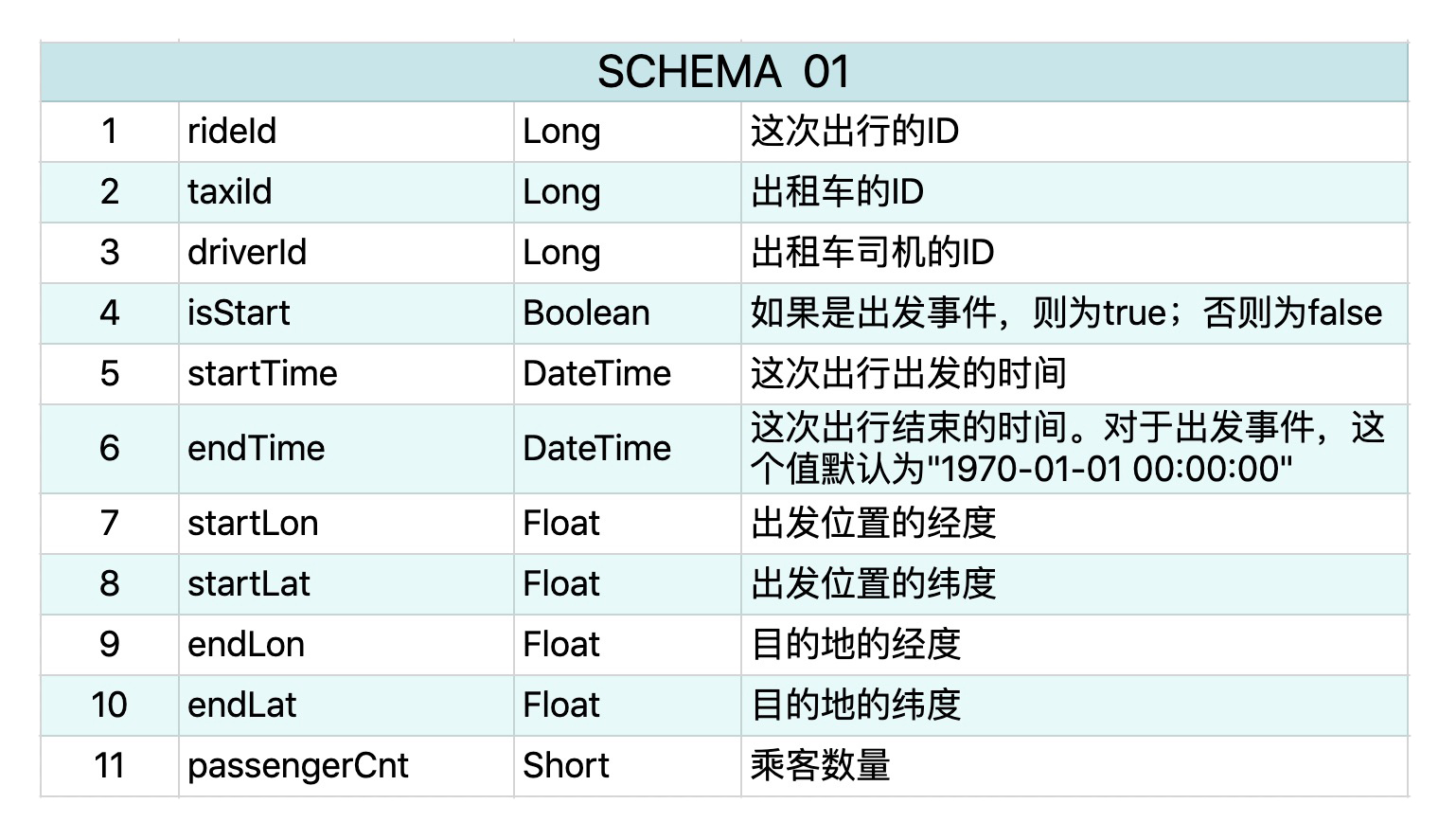 今天的数据集是纽约市2009~2015年出租车载客的信息。每一次出行包含了两个事件,一个事件代表出发,另一个事件代表到达。每个事件都有11个属性,它的schema如下所示: