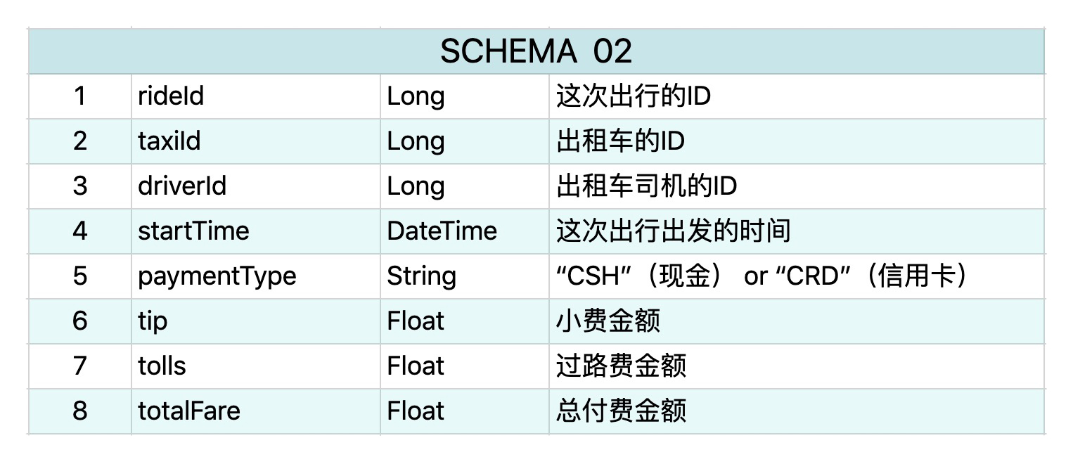 这个数据还包含有另外一部分信息,就是所有出租车的付费信息,它有8个属性,schema如下所示。