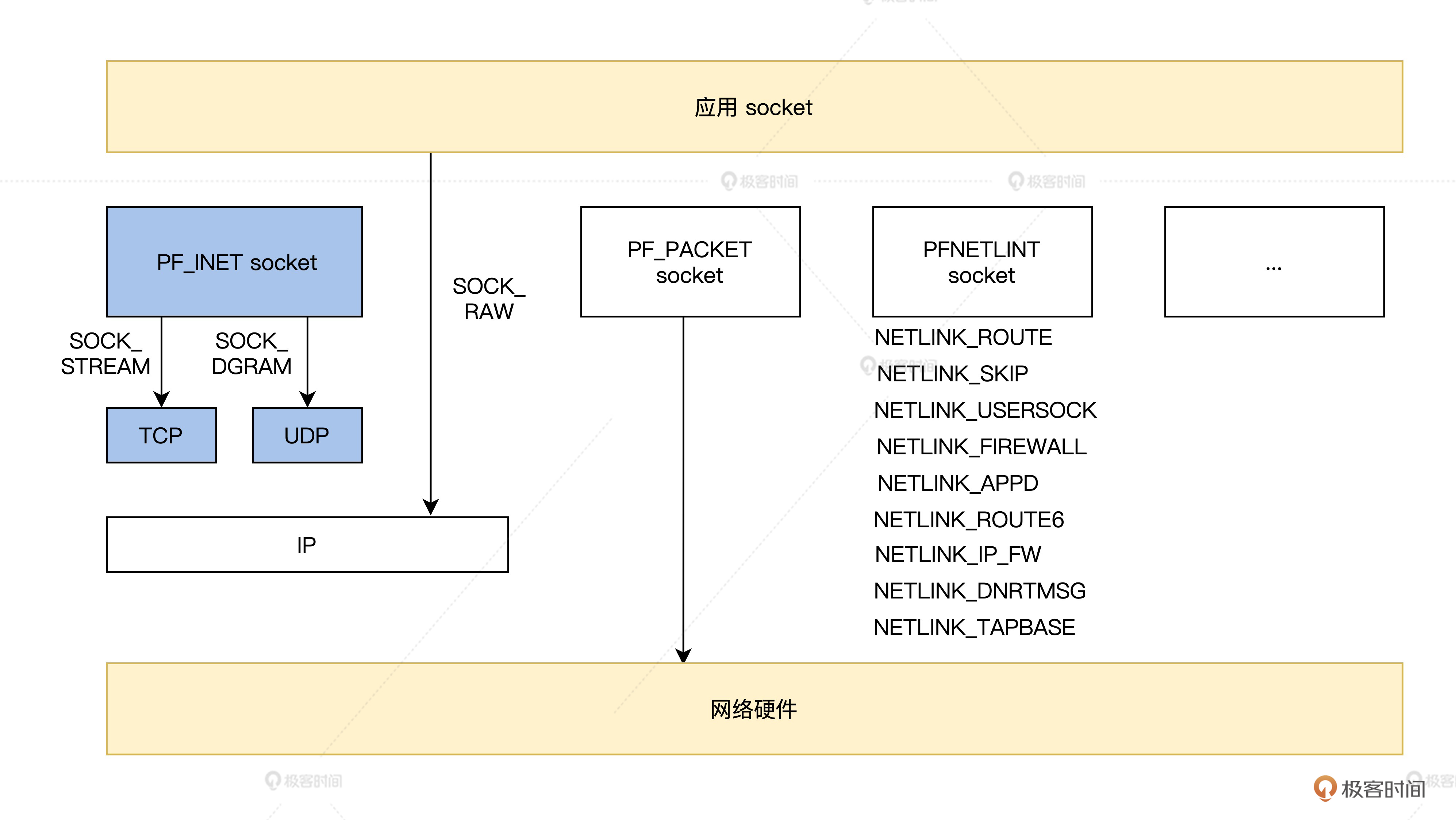 我们会重点讲解跟网络子系统和TCP/IP协议栈息息相关的一种套接字——Internet 套接字。如果你对其他类型的套接字有兴趣,可以自行阅读这里的资料。