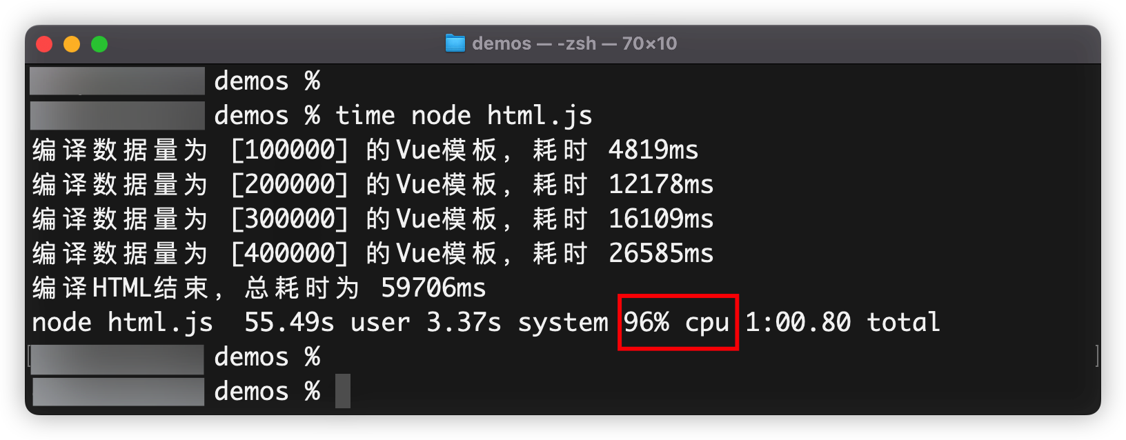 我们用Node.js的多线程模块来运行Vue.js代码的密集计算,也用Linux下的“time”命令执行,可以看到结果。