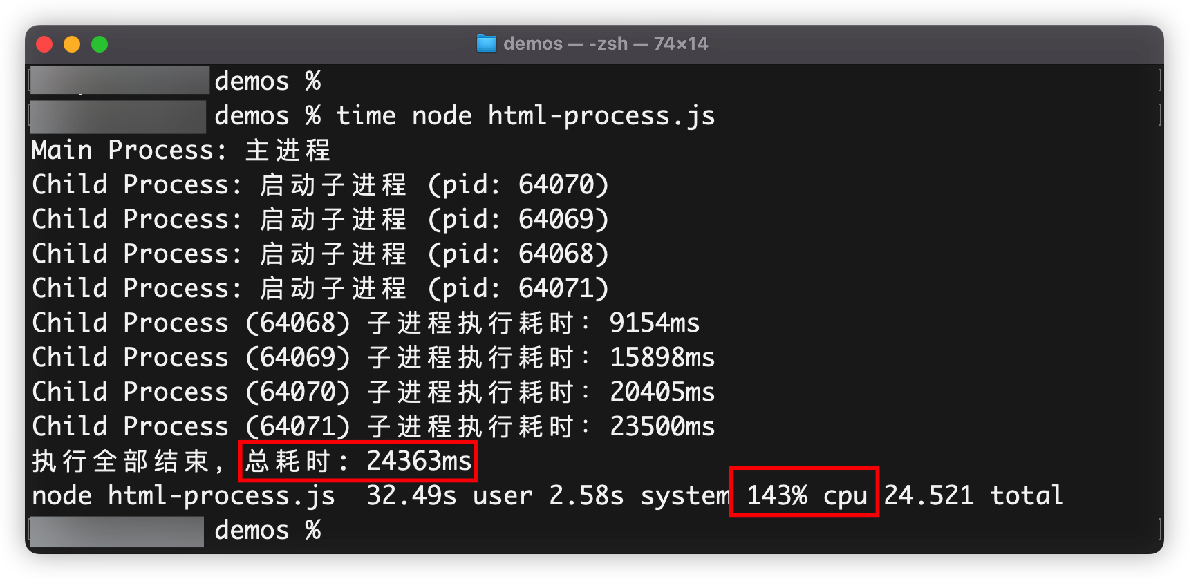 从截图可以看出,多线程执行的耗时24秒左右,CPU使用率达到143%,这是因为使用了多进程,也同样发挥了多核CPU的算力,得到了性能的提升。