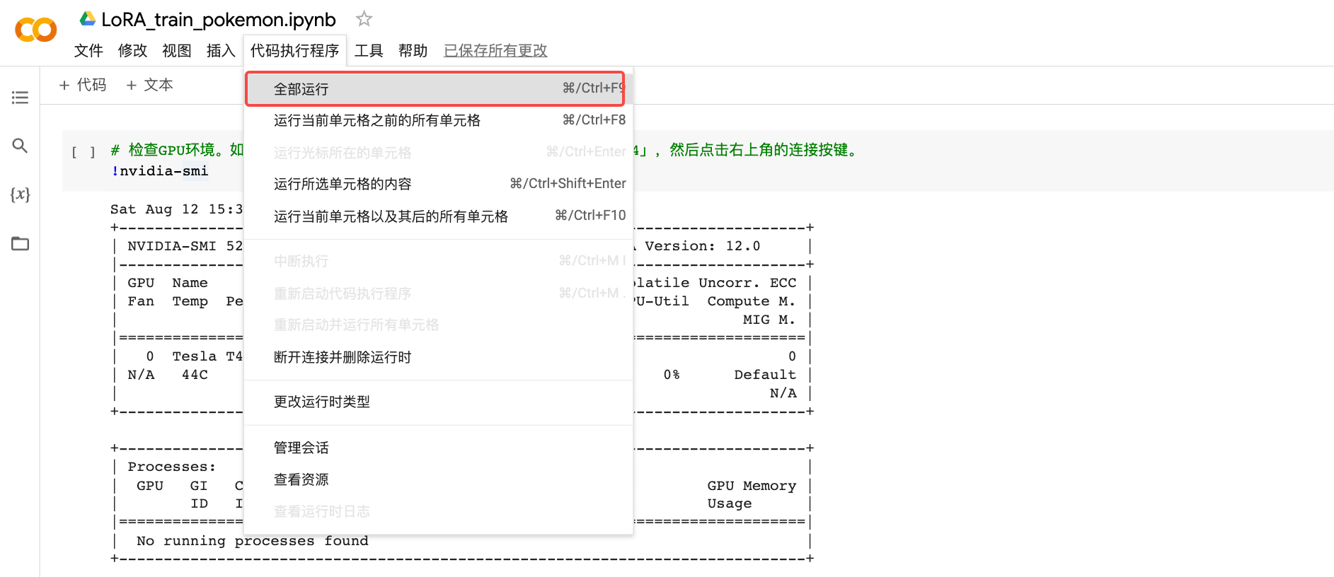 为了方便你体验效果,在配置好Colab的GPU环境后,你可以直接点击全部运行,这样就能“一键”完成LoRA的训练。