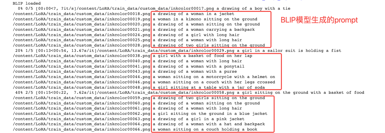 我们要在彩铅模型训练的Colab中,运行make_captions.py这个脚本,并指定原始图片的路径。这样脚本就会自动下载好BLIP模型,并针对提供的每张图依次进行模型推理生成prompt。你可以点开图像查看prompt的生成效果。