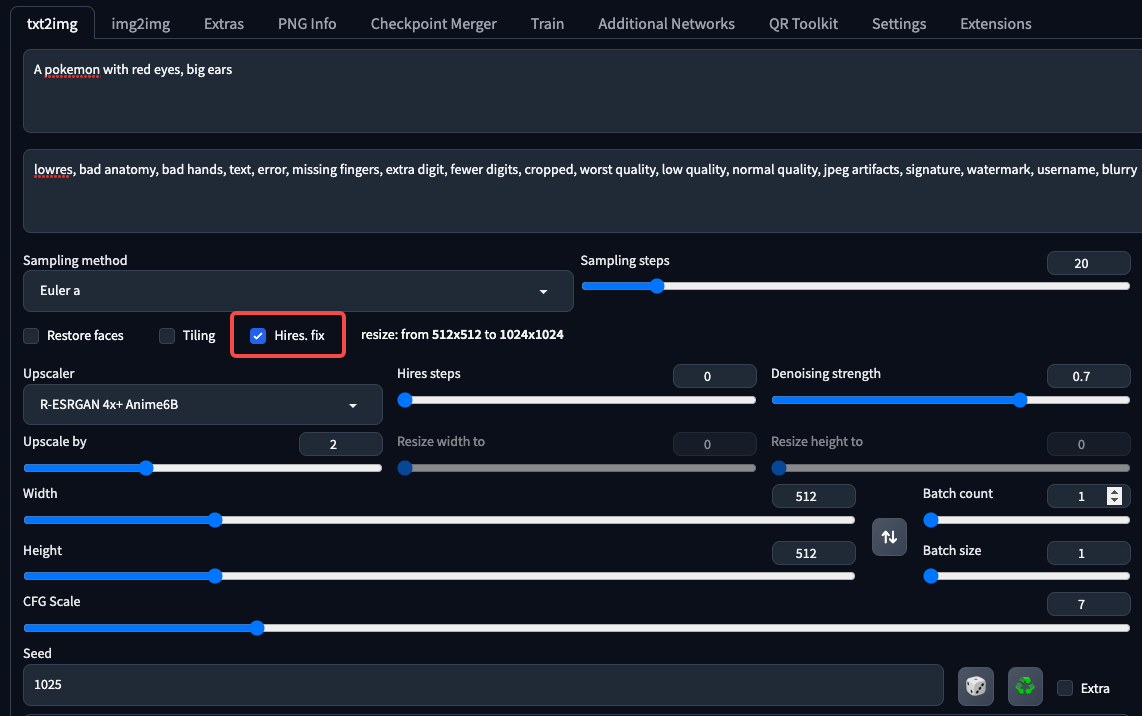 一切准备完毕,我们这就来测试下WebUI的使用效果,可以使用下面这组prompt来测试宝可梦模型。
