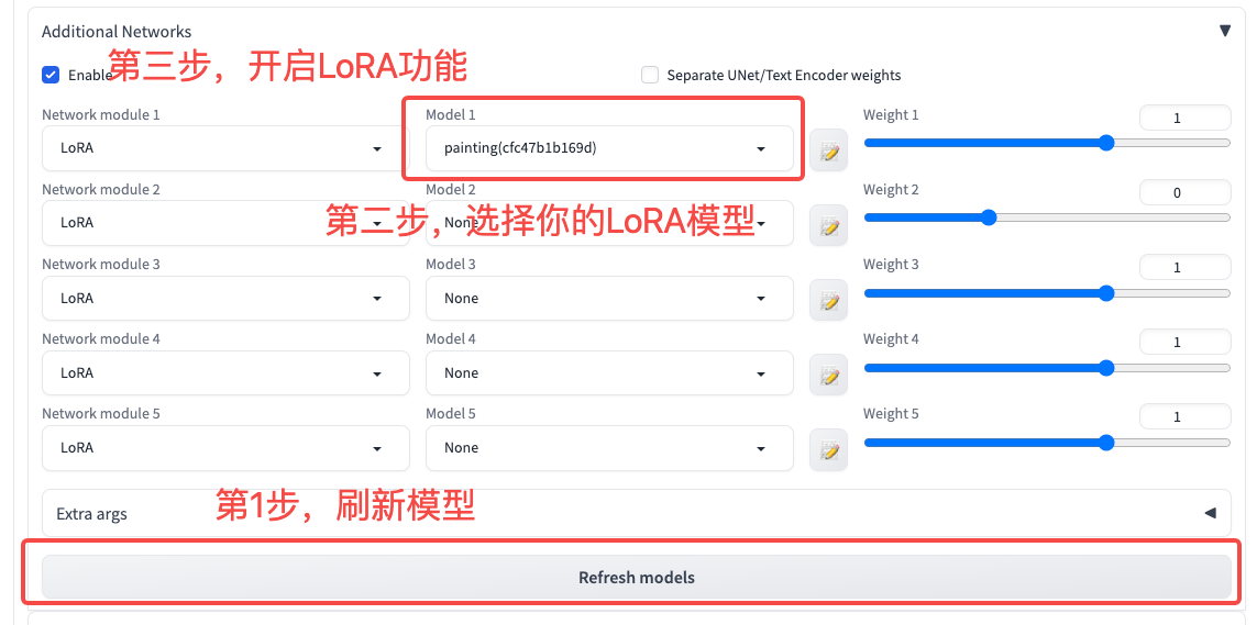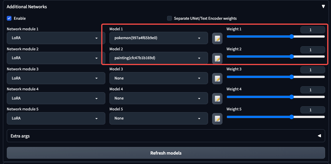 关于LoRA模型,我们还可以做两个有意思的效果测试。第一个测试是将我们得到的两个LoRA模型组合使用。你可以在WebUI中按照图中的方式进行操作。