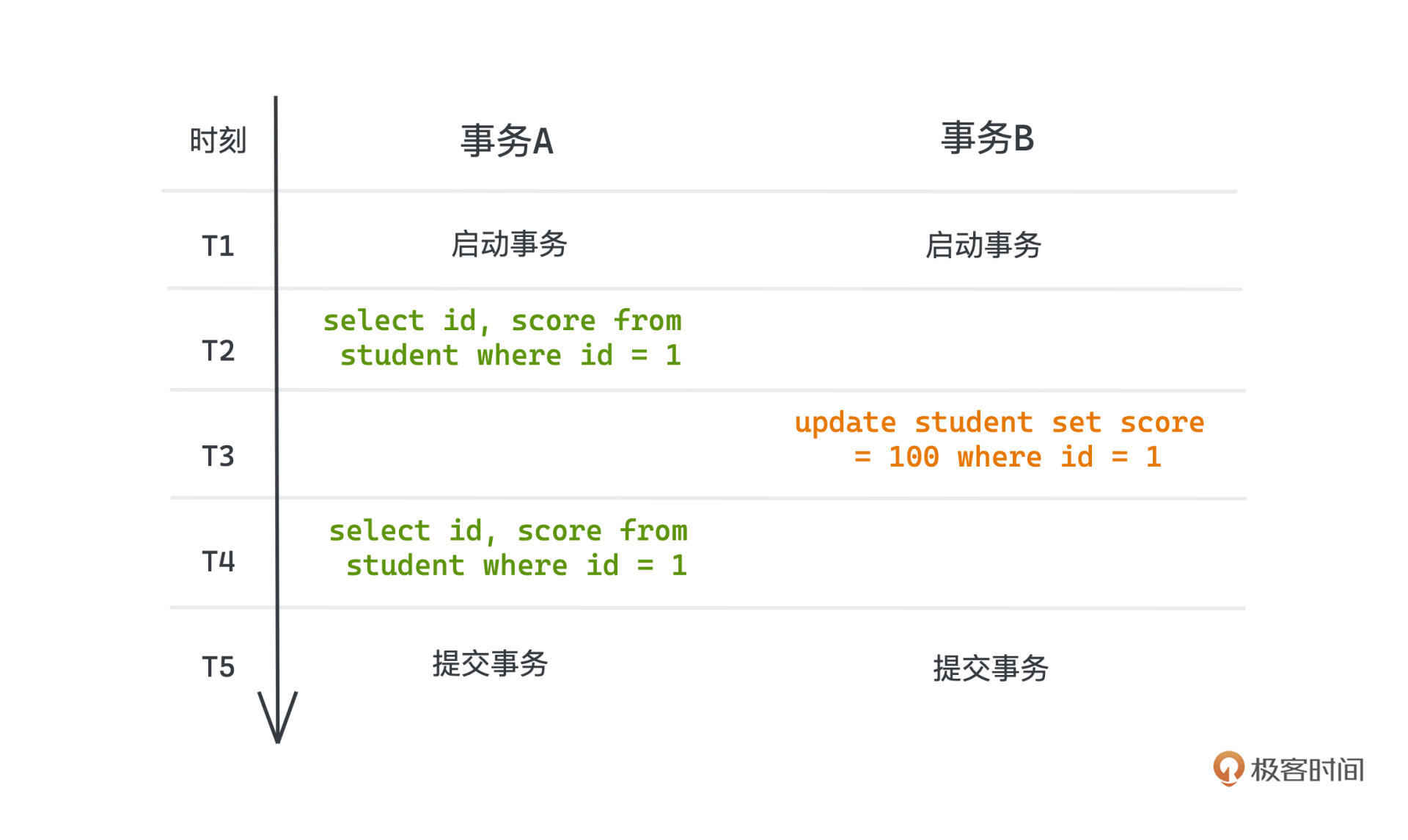 在读提交的隔离等级下,T2还是读到50,这次在T4的时候我们不再会读到脏值100,但在T5事务B已经提交的时候,T6再去读同一个记录,会读到事务B提交之后更新的值100。这个时候,在同一个事务里,两次读到的数据就出现了不一致的情况,也就是仍然会出现不可重复读,但已经不会出现脏读的情况了。