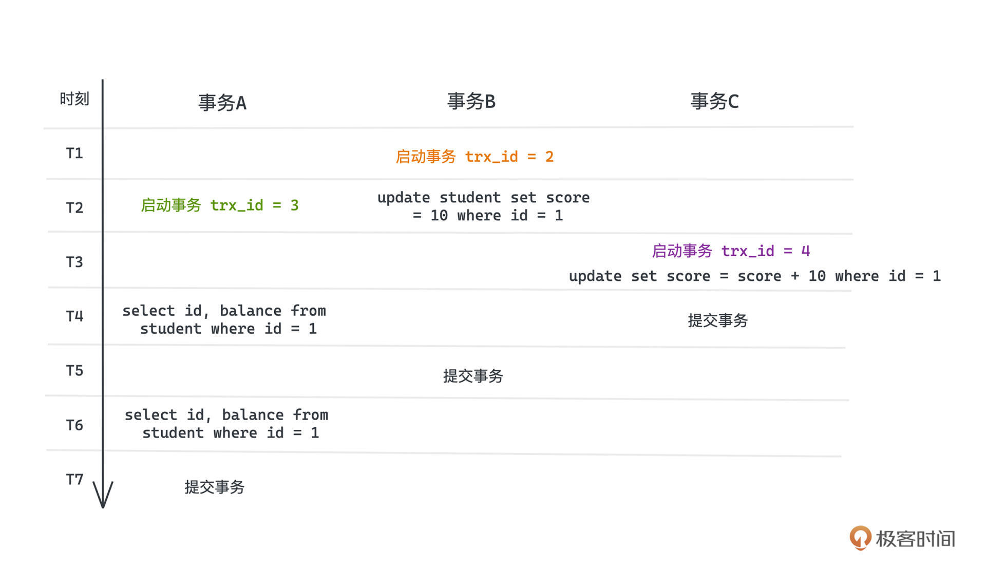 在事务A启动的时候,由于晚于事务B、早于事务C,申请到的trx_id=3,而视图数组里活跃的事务只有trx_id=2的事务B,也就是长这样 [trx_id=2] 。