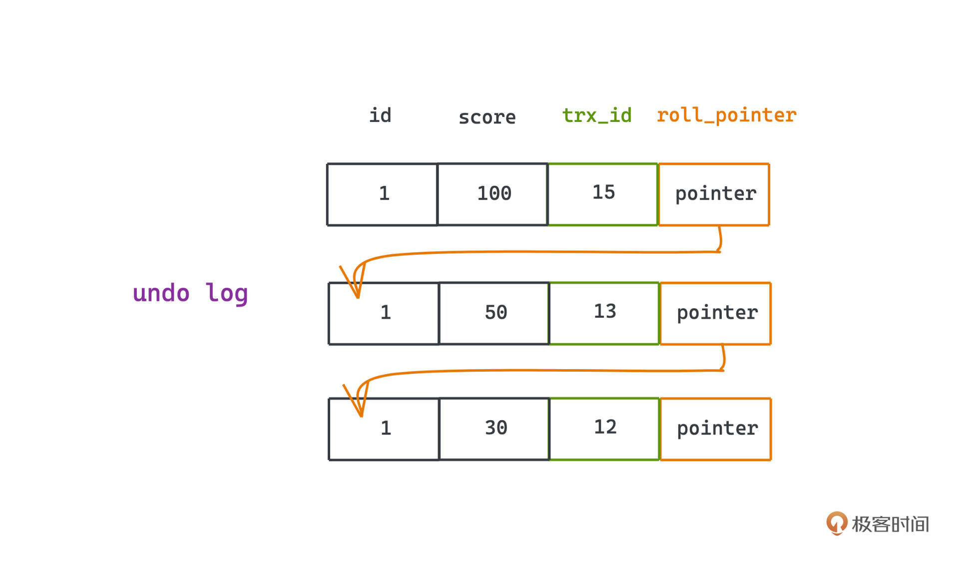 你可以看到,由于 roll_pointer 的存在,整个数据库中的每行数据,背后都可能有不止一条数据,每个transaction的修改都会在表中留下痕迹,而它们通过 roll_pointer 形成了一个类似于单向链表的数据结构,我们称为版本链。所以每次新插入一条数据,除了插入数据本身和申请事务ID,我们也要记得把pointer指向此前数据的undo_log。