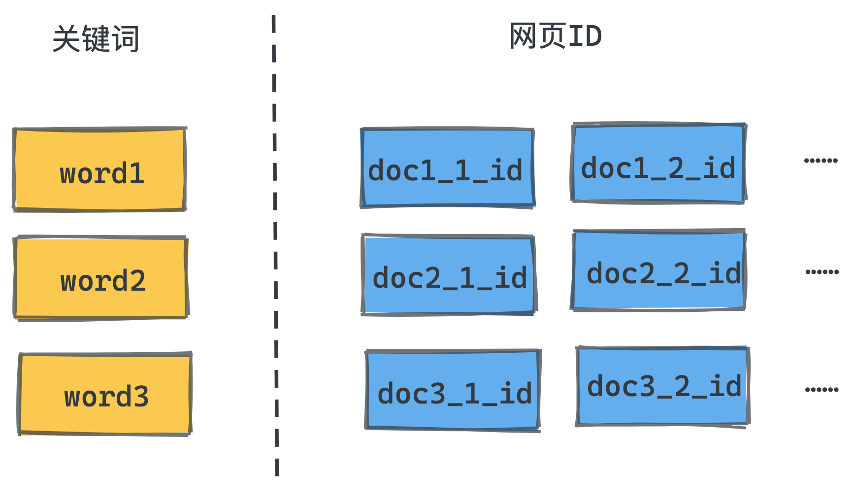 解决方式就是用空间换时间,在搜索引擎中引入倒排索引,提前预处理存储的全部数据,整理出每个单词到网页ID的映射关系,并记录下来;这样我们就可以得到单词到倒排列表的映射,从而快速查询关键词匹配的网页。有了倒排索引后,我们也很容易对多个关键词做与查询。
