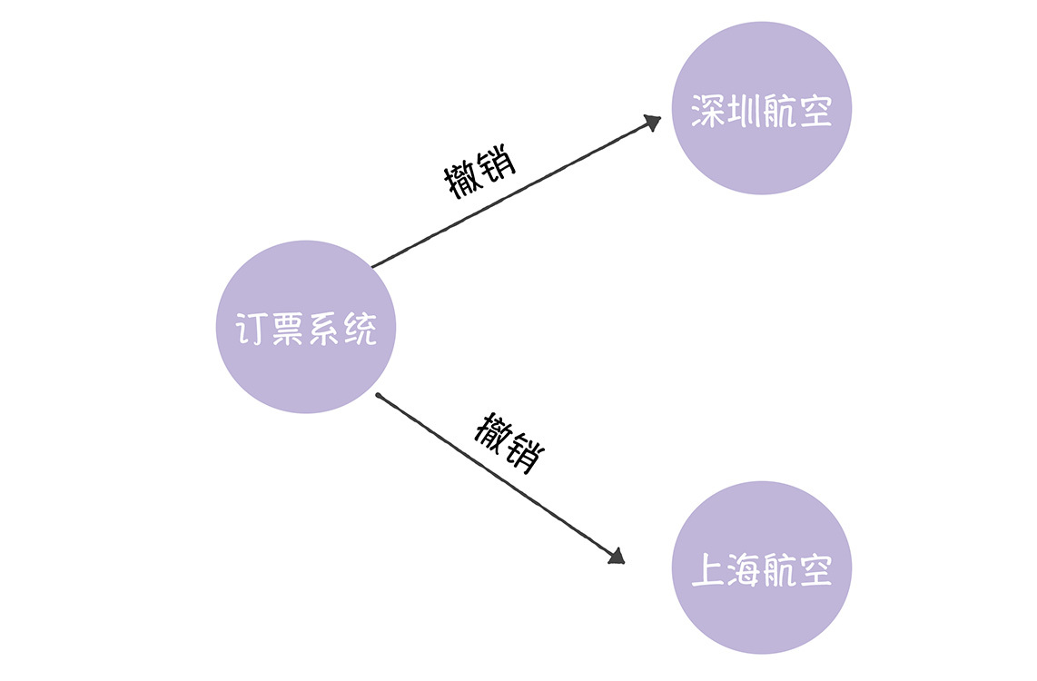 但如果此时有机票没有预留成功(比如深圳航空的从深圳到上海的机票),那这时该怎么办呢?这时订票系统就需要通过撤销接口来撤销订票请求。
