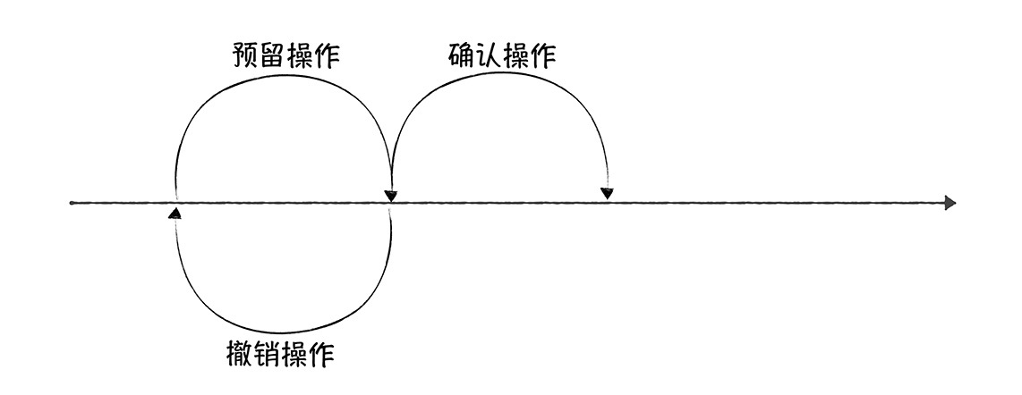 在[04讲],我们介绍了TCC,你如果对TCC不熟悉,或者忘记了,那么可以回过头复习一下。在这里,我只想补充一点,那就是:你可以对比二阶段提交协议来理解,TCC包含的预留、确认或撤销这 2 个阶段,比如: