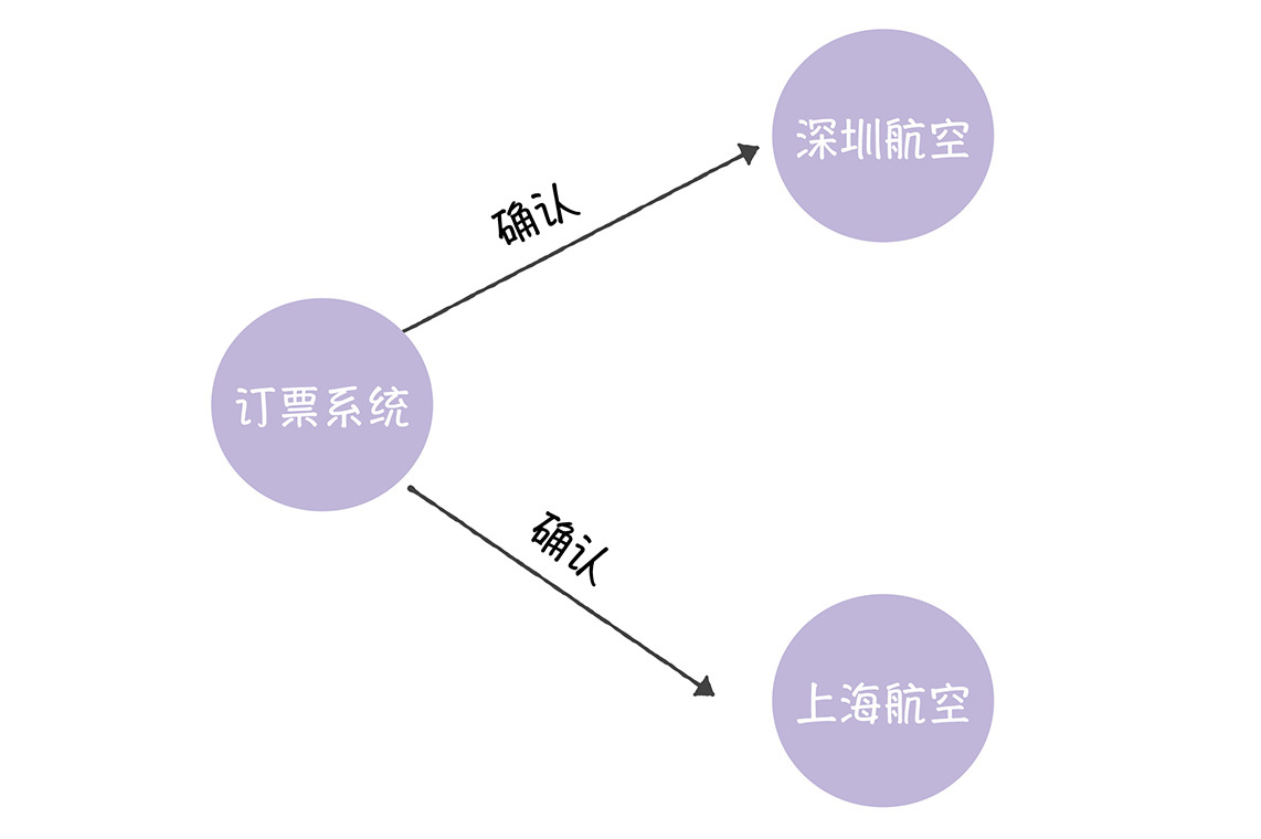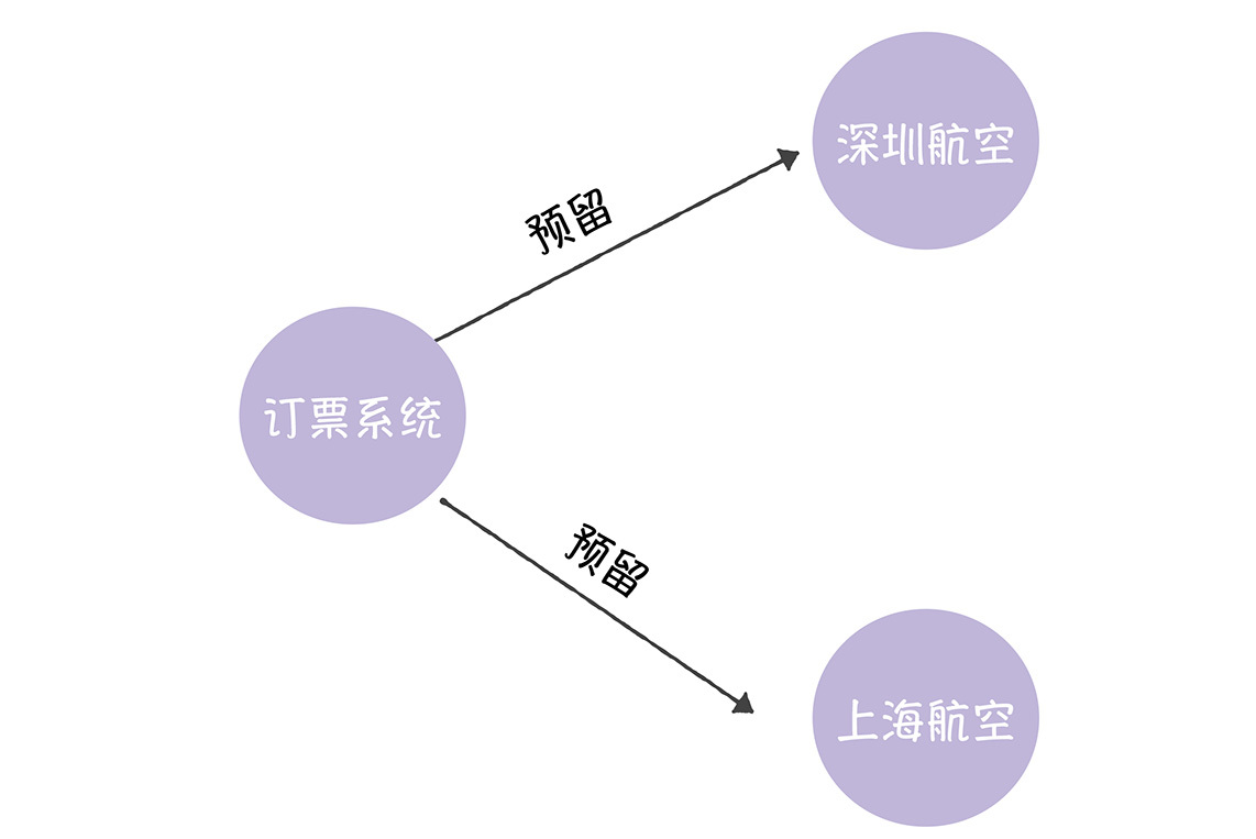 首先,订票系统调用2个航空公司的机票预留接口,向2个航空公司申请机票预留。