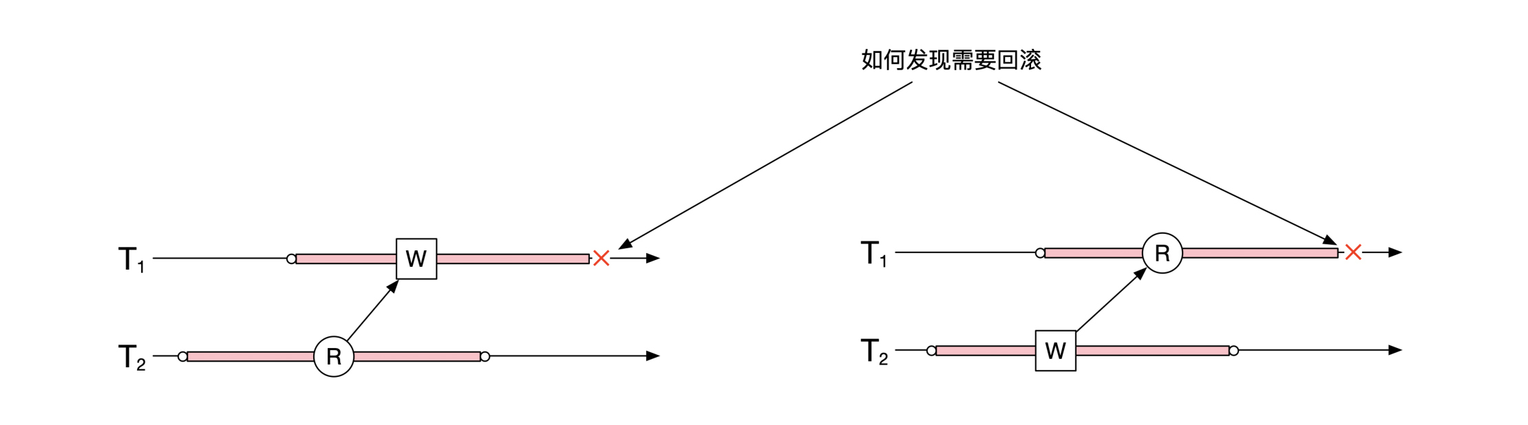 第二种情况是上图右边的情况。这时候数据库需要记录T1的读操作忽略了哪些相关的、还没有结束的事务。这时候如果T1还有任何写的操作,那么就需要考虑将T1回滚。需要你注意的是,如果T1一直只是读取数据,没有任何写的操作,那么T1是不需要回滚的。