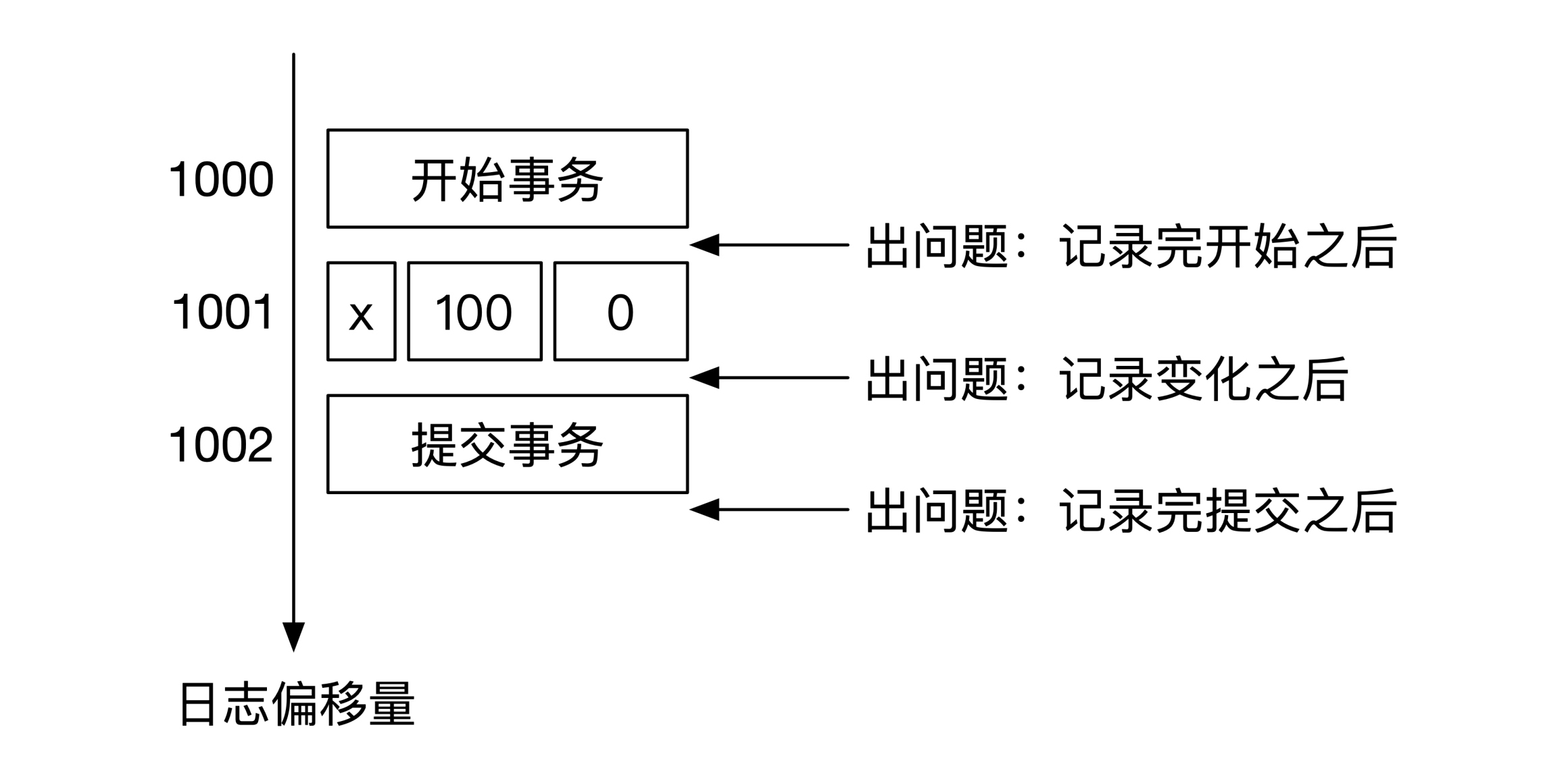 还是这个例子,一共可能在3个地方出现问题,一个还是记录了 开始事务 之后,一个是在记录了 x 的前后变化之后,最后一个地方是在记录了 事务提交 之后。下面这幅图给你展示了这3个可能会出问题的时间:
