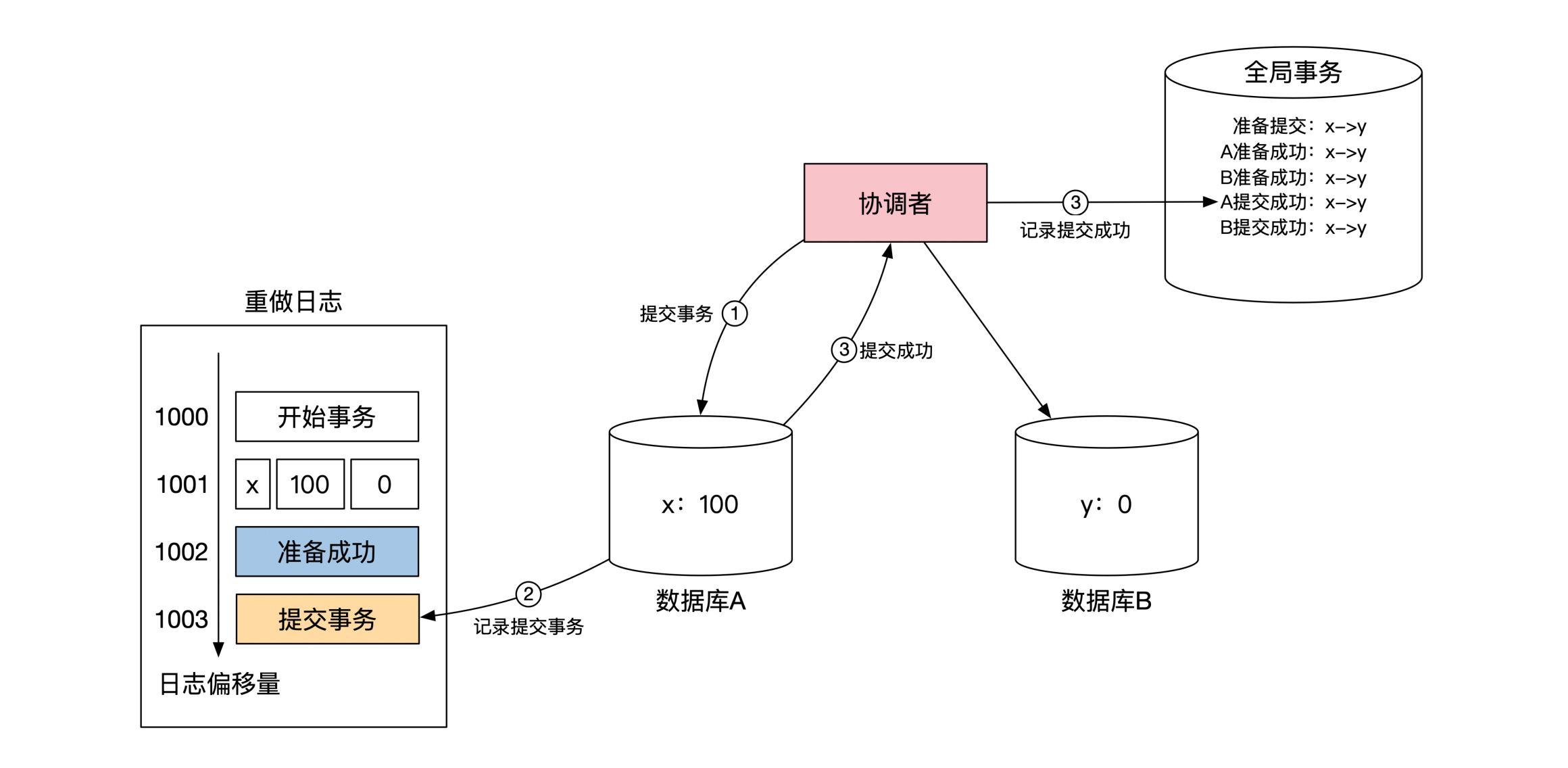 当数据库 A 将对 x 的操作记录到重做日志之后,会在重做日志里记录一个 准备成功 的标记,然后返回给协调者自己已经准备成功的消息。数据库 B 的情况完全一样,所以这里我没有画出来。