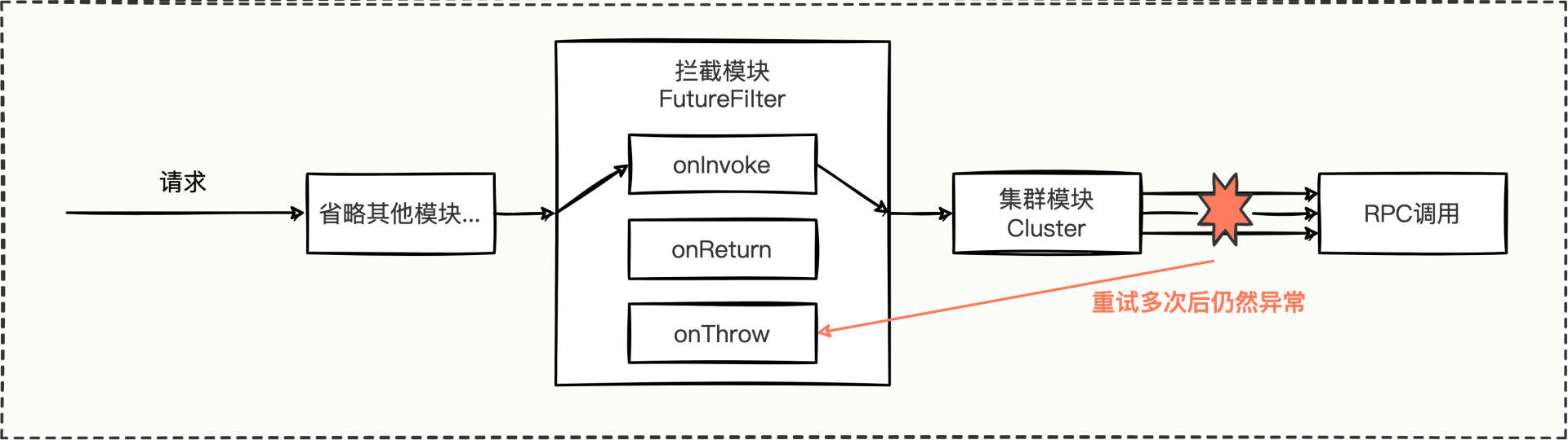 请求会经历一些其他的模块,但始终会经过 FutureFilter 过滤器,过滤器内部先触发调用 onInvoke 方法,然后紧接着触发集群模块进行RPC调用。