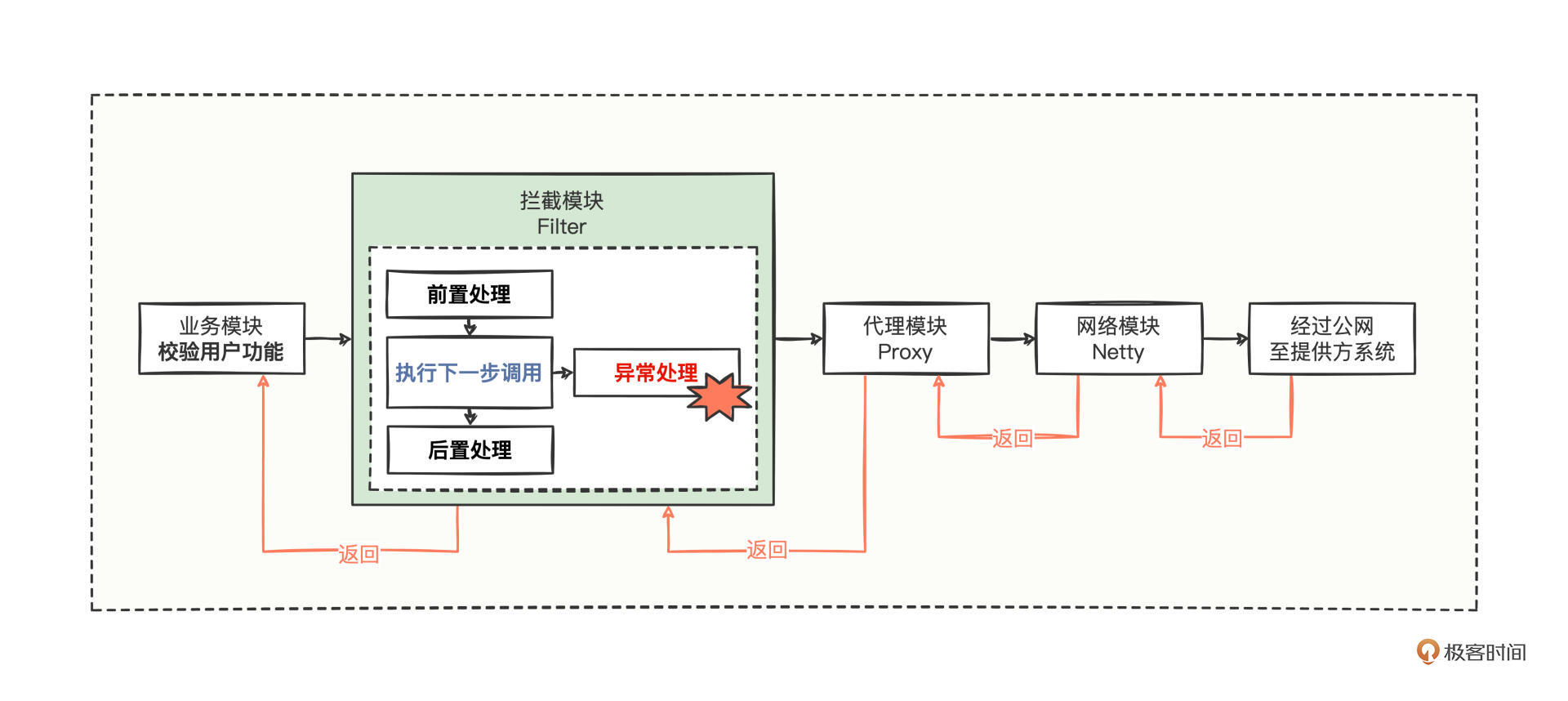 正常逻辑很流畅,但思维缜密的你考虑到异常逻辑,发现了一个细节问题:在事件通知处理类的 onInvoke 方法中,参数不合法会抛异常,那抛出的这个异常会中断调用流程么?或者说 onInvoke 抛出异常后,消费方还会把请求发到提供方么?